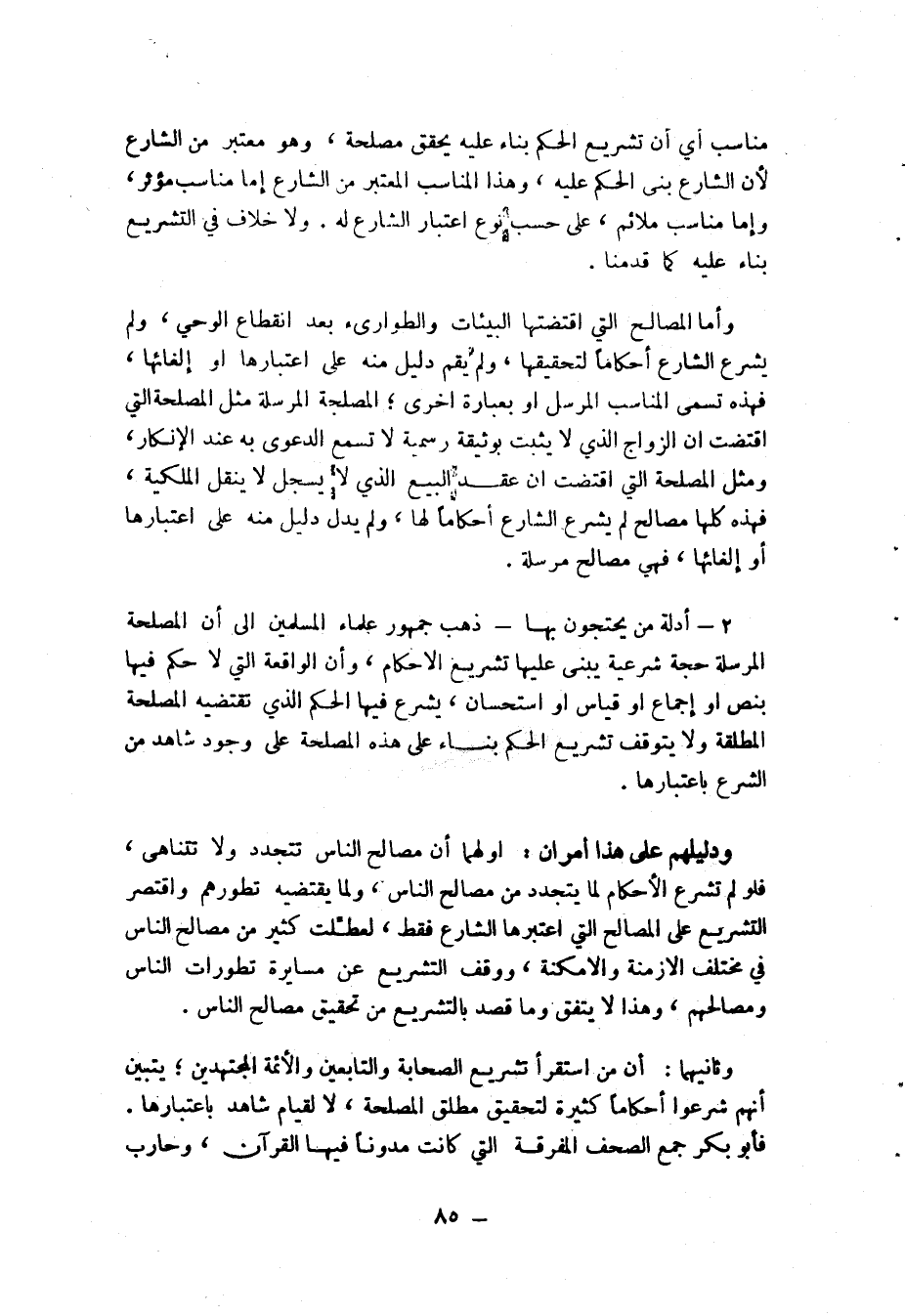 وأما المصالح التي اقتضتها البيئات والطوارئ بعد انقطاع الوحي، ولم يشرع الشارع أحكاما لتحقيقها، ولم يقم دليل منه على اعتبارها أو إلغائها، فهذه تسمى المناسب المرسل أو بعبارة أخرى المصلحة المرسلة. مثل المصلحة التي اقتضت أن الزواج الذي لا يثبت بوثيقة رسمية لا تسمع الدعوى به عند الإنكار، ومثل المصلحة التي اقتضت أن عقد البيع الذي لا يسجل لا ينقل الملكية، فهذه كلها مصالح لم يشرع الشارع أحكاما لها، ولم يدل دليل منه على اعتبارها أو إلغاءها، فهي مصالح مرسلة.
