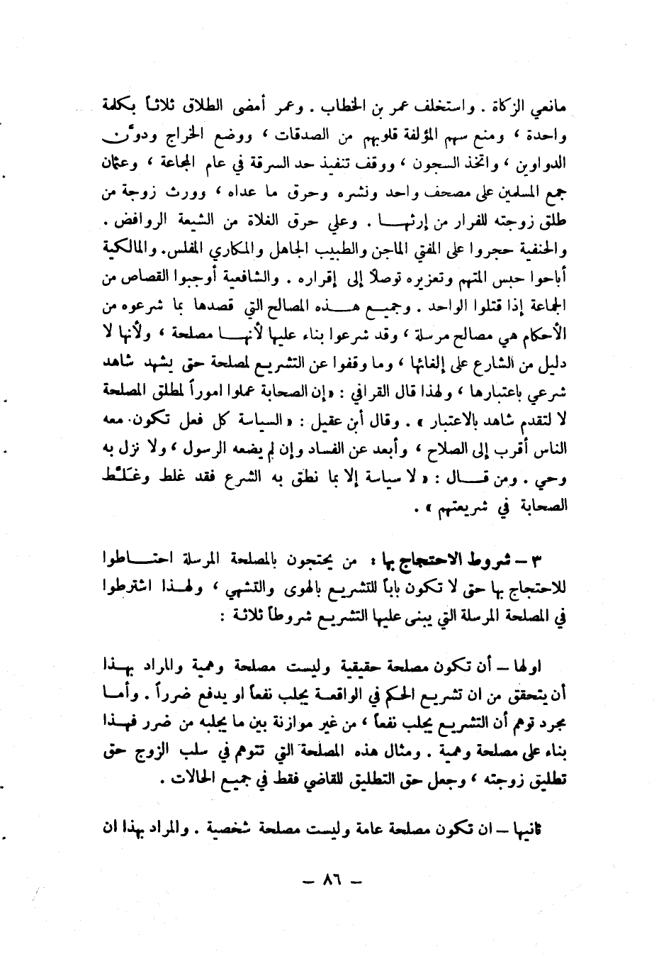 وجميع هذه المصالح التي قصدوها بما شرعوه من الأحكام هي مصالح مرسلة، وقد شرعوا بناء عليها لأنها مصلحة، ولأنها دليل من الشارع على إلغائها، وما وقفوا عن التشريع لمصلحة حتى يشهد شاهد شرعي باعتبارها، ولهذا قال القرافي: "إن الصحابة عملوا أمورا لمطلق المصلحة لا لتقدم شاهد بالاعتبار". وقال ابن عقيل: "السياسة كل فعل تكون معه الناس أقرب إلى الصلاح، وأبعد عن الفساد، وإن لم يضعه الرسول، ولا نزل به وحي، ومن قال: لا سياسة إلا بما نطق به الشرع، فقد غلط وغلّط الصحابة في شريعتهم"