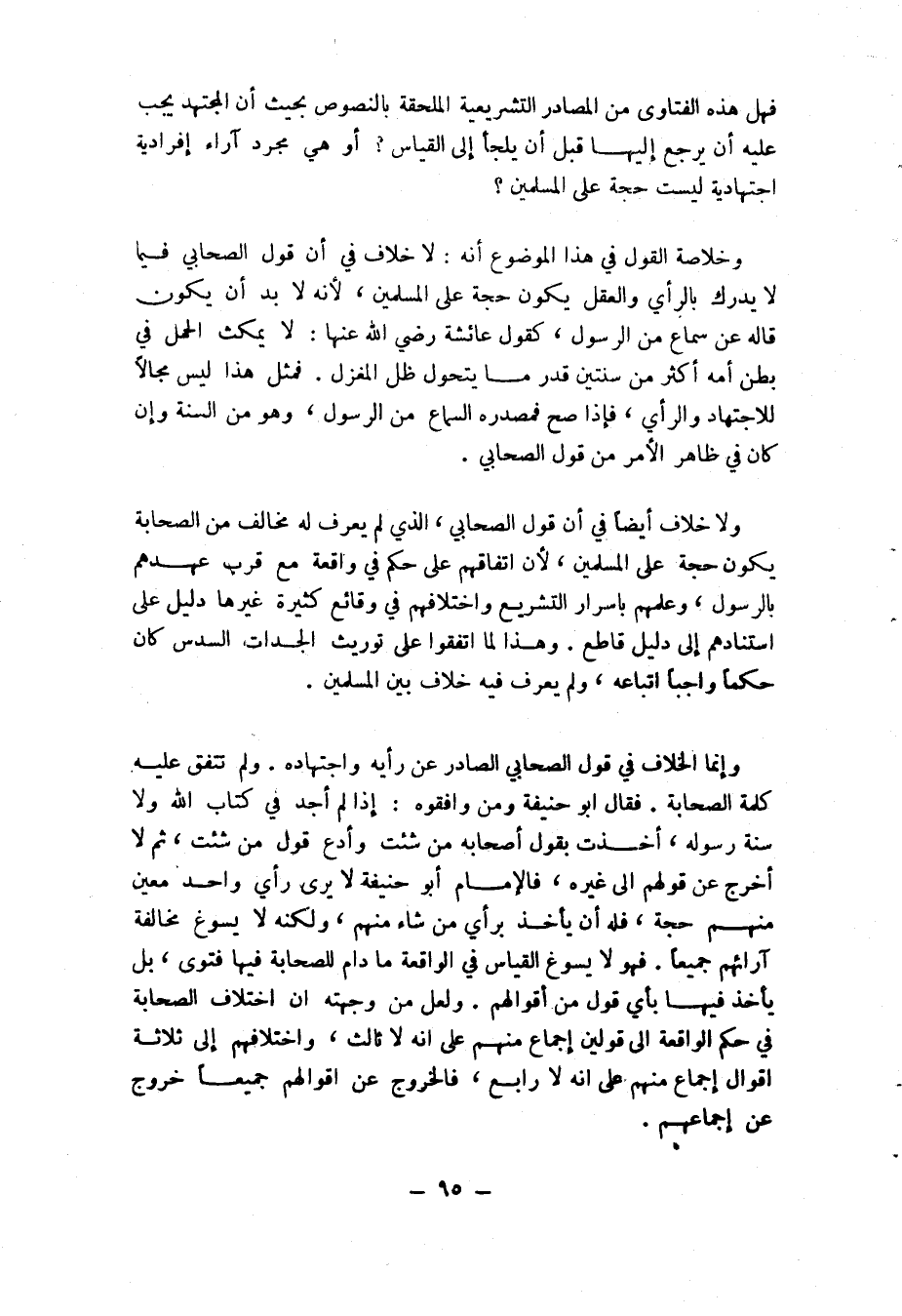 فقال أبو حنيفة ومن وافقوه: إذا لم أجد في كتاب الله ولا سنة رسوله، أخذت بقول أصحابه من شئت وأدع قول من شئت، ثم لا أخرج عن قولهم إلى غيره. فالإمام أبو حنيفة لا يرى رأي واحد معين منهم حجة، فله أن يأخذ برأي من شاء منهم، ولكنه لا يسوغ مخالفة آرائهم جميعا، فهو لا يسوغ في القياس في الواقعة ما دام للصحابة في حكم الواقعة فيها بأي قول من أقوالهم. ولعل من وجهته أن اختلاف الصحابة في حكم الواقعة إلى قولين إجماع منهم على أنه لا ثالث، واختلافهم إلى ثلاثة أقوال إجماع منهم على أنه لا رابع، فالخروج من أقوالهم جميعا خروج عن إجماعهم.