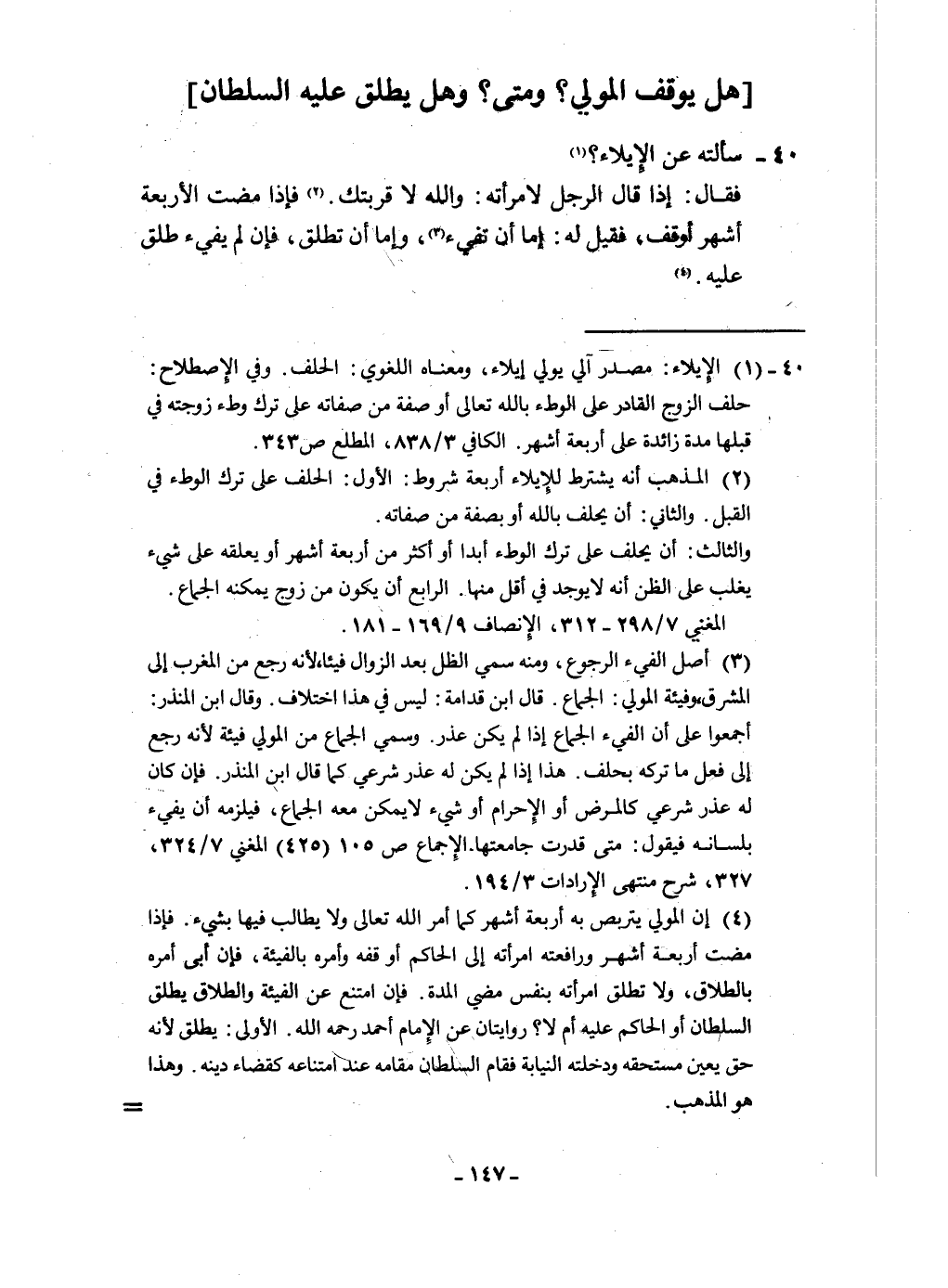 40 - سَأَلته عَن الْإِيلَاء فَقَالَ إِذا قَالَ الرجل لامْرَأَته وَالله لَا قربتك فَإِذا مَضَت الْأَرْبَعَة أشهر أوقف فَقيل لَهُ إِمَّا أَن تفيء وَإِمَّا أَن تطلق فَإِن لم يفِيء طلق عَلَيْهِ