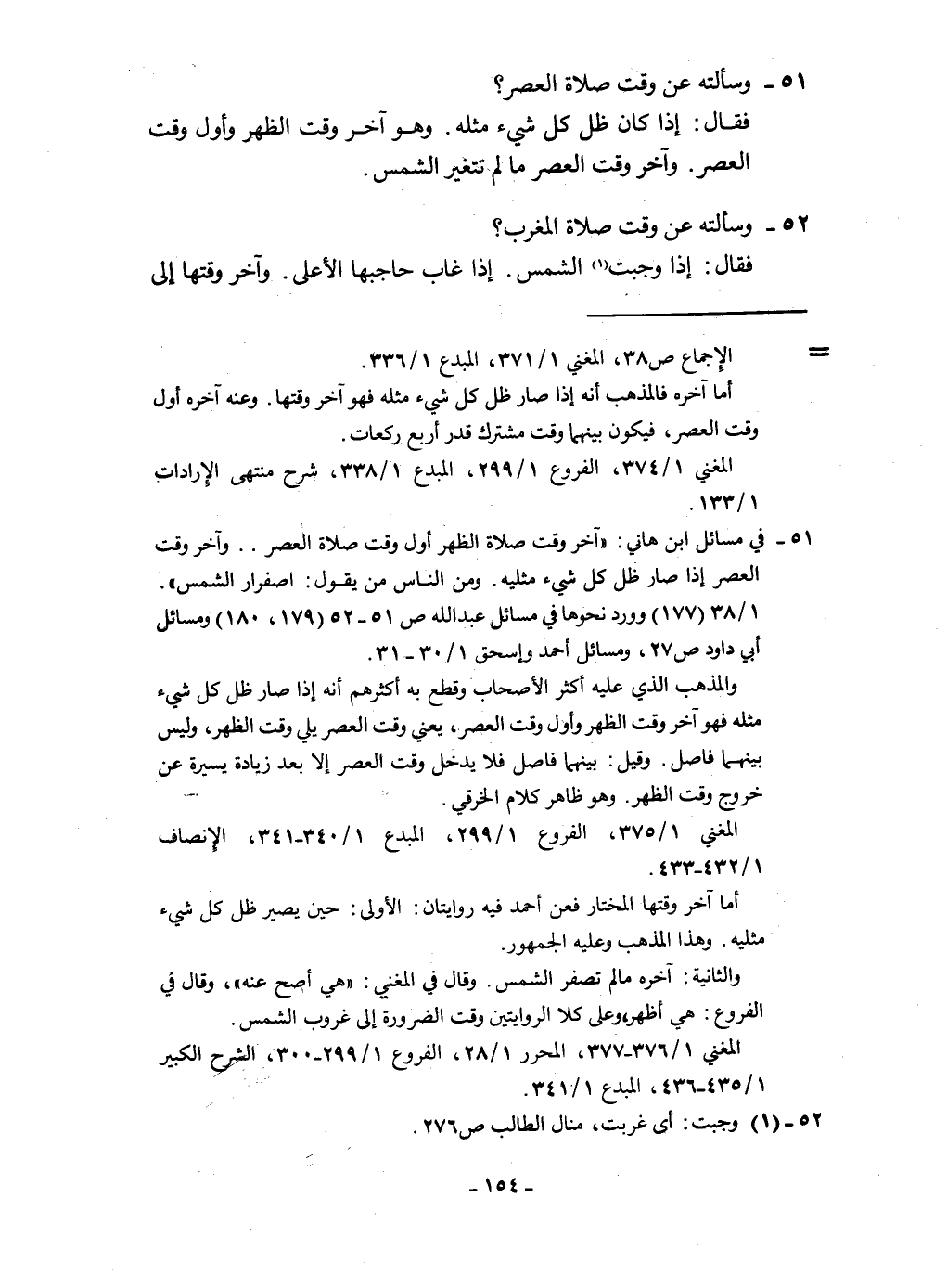 51 - وَسَأَلته عَن وَقت صَلَاة الْعَصْر فَقَالَ إِذا كَانَ ظلّ كل شَيْء مثله وَهُوَ آخر وَقت الظّهْر وَأول وَقت الْعَصْر وَآخر وَقت الْعَصْر مَا لم تَتَغَيَّر الشَّمْس