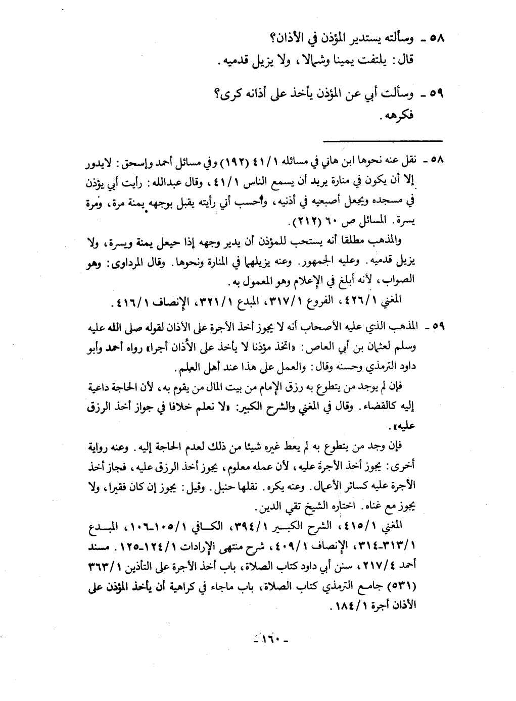 58 - وَسَأَلته يستدير الْمُؤَذّن فِي الْأَذَان قَالَ يلْتَفت يَمِينا وَشمَالًا وَلَا يزِيل قَدَمَيْهِ