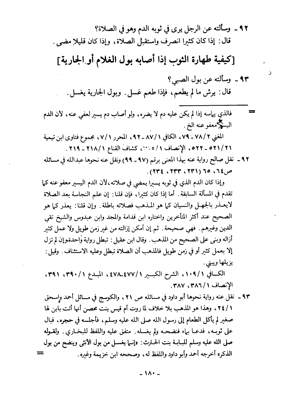 93 - وَسَأَلته عَن بَوْل الصَّبِي قَالَ يرش مَا لم يطعم فَإِذا طعم غسل وَبَوْل الْجَارِيَة يغسل