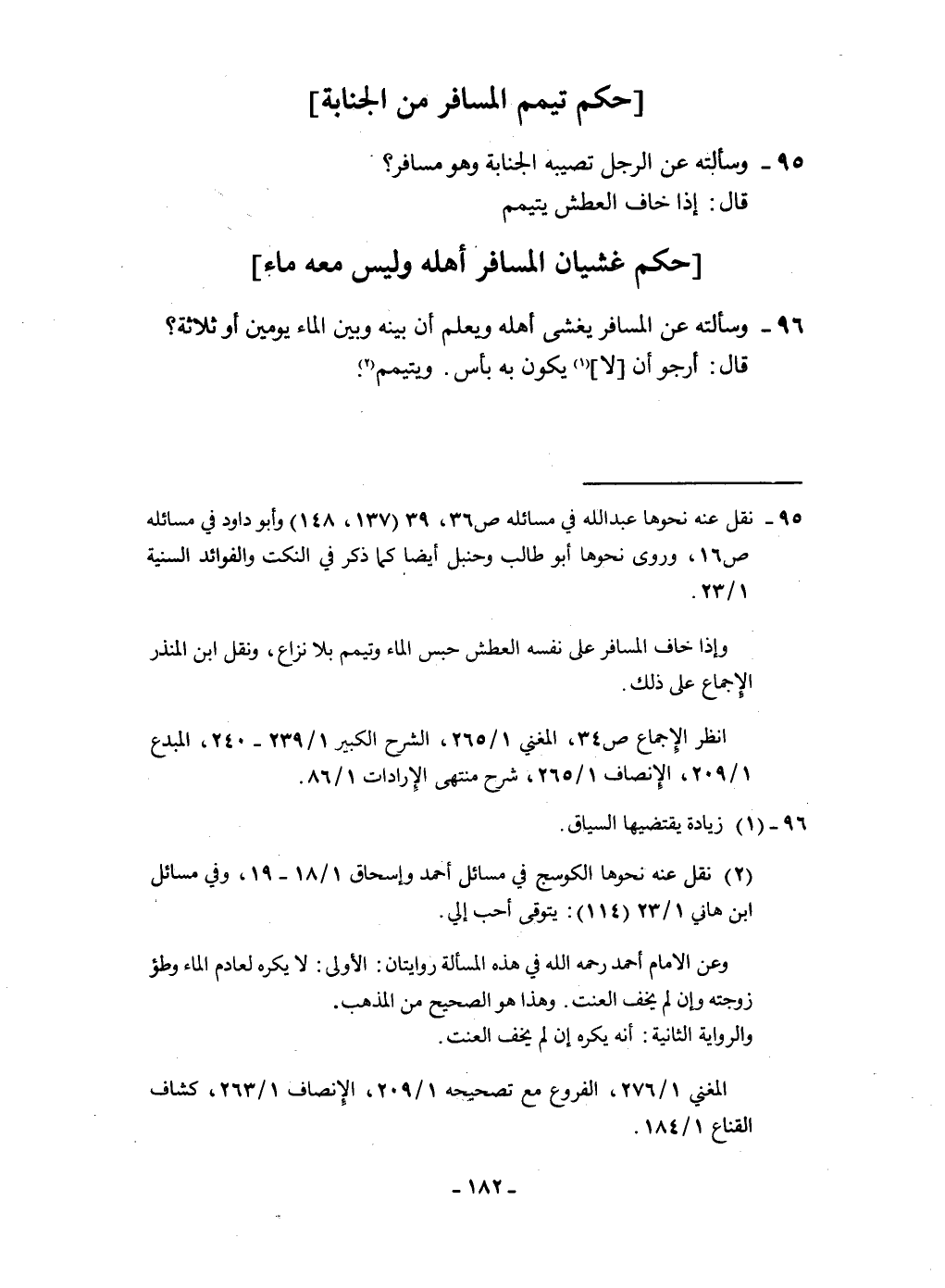 96 - وَسَأَلته عَن الْمُسَافِر يغشى أَهله وَيعلم أَن بَينه وَبَين المَاء يَوْمَيْنِ أَو ثَلَاثَة قَالَ أَرْجُو أَن لَا يكون بِهِ بَأْس وَيتَيَمَّم
