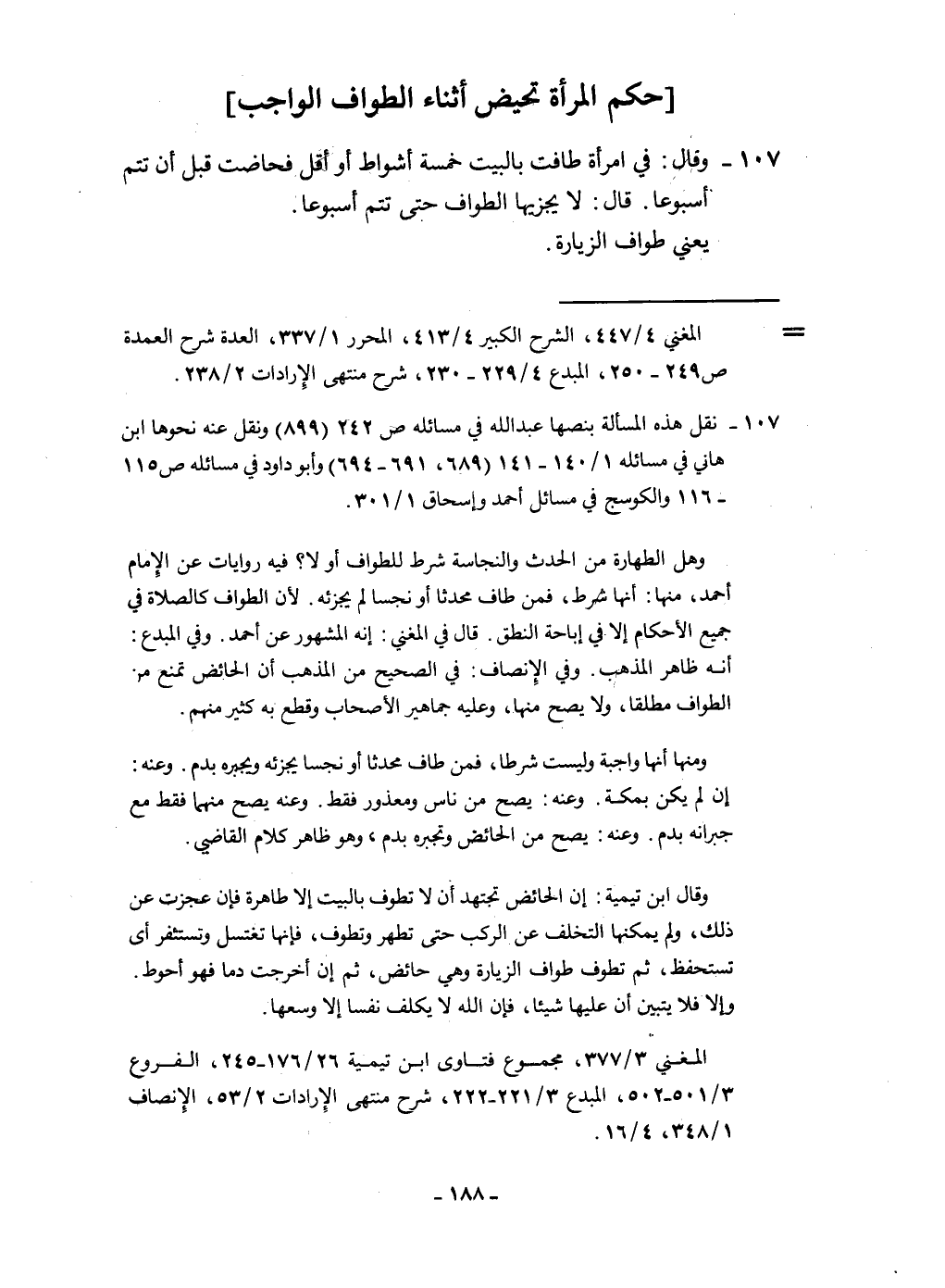 107 - وَقَالَ فِي امْرَأَة طافت بِالْبَيْتِ خَمْسَة أَشْوَاط أَو أقل فَحَاضَت قبل أَن تتمّ أسبوعا قَالَ لَا يجزيها الطّواف حَتَّى تتمّ أسبوعا يَعْنِي طواف الزِّيَارَة