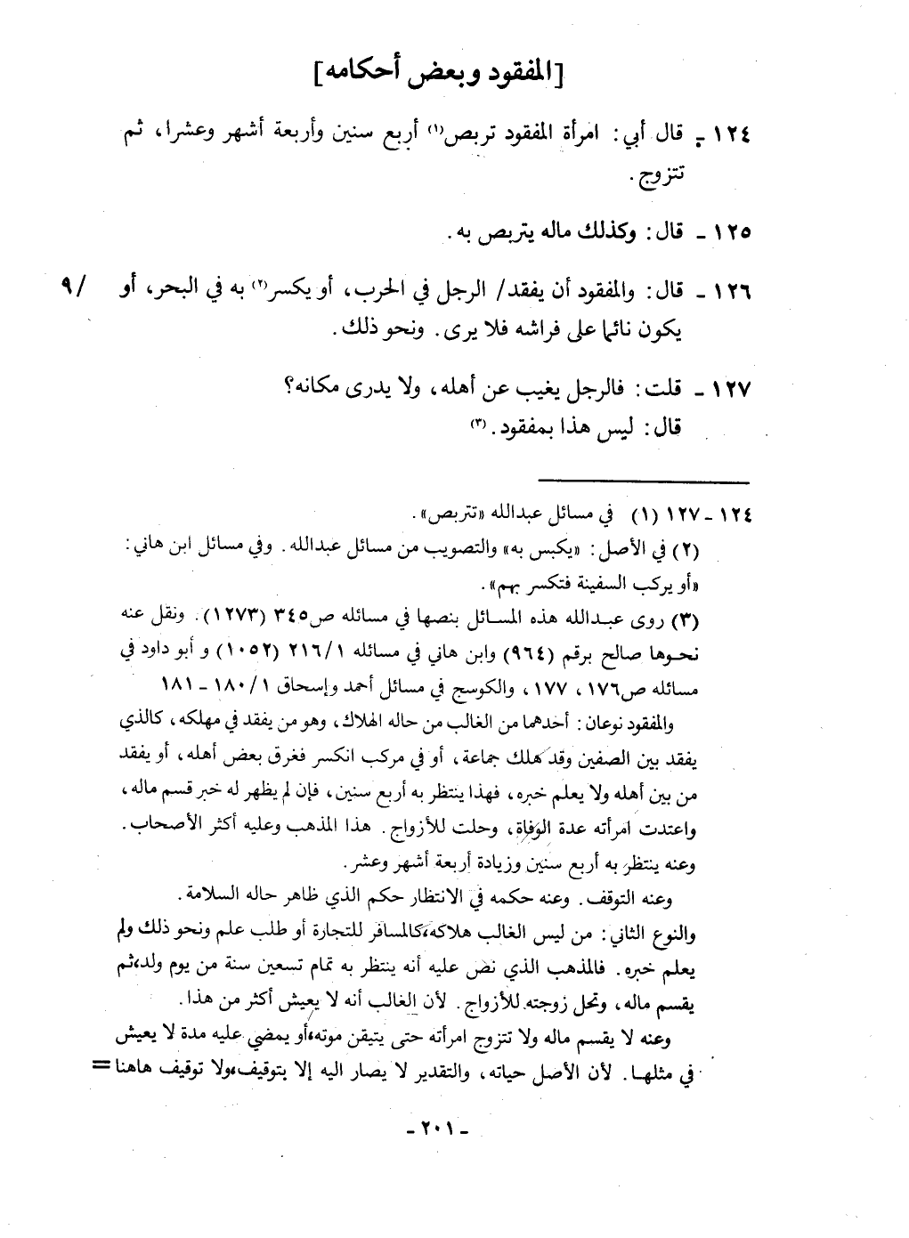 126 - قَالَ والمفقود أَن يفقد الرجل فِي الْحَرْب أَو يكسر بِهِ فِي الْبَحْر أَو يكون نَائِما على فرَاشه فَلَا يرى وَنَحْو ذَلِك