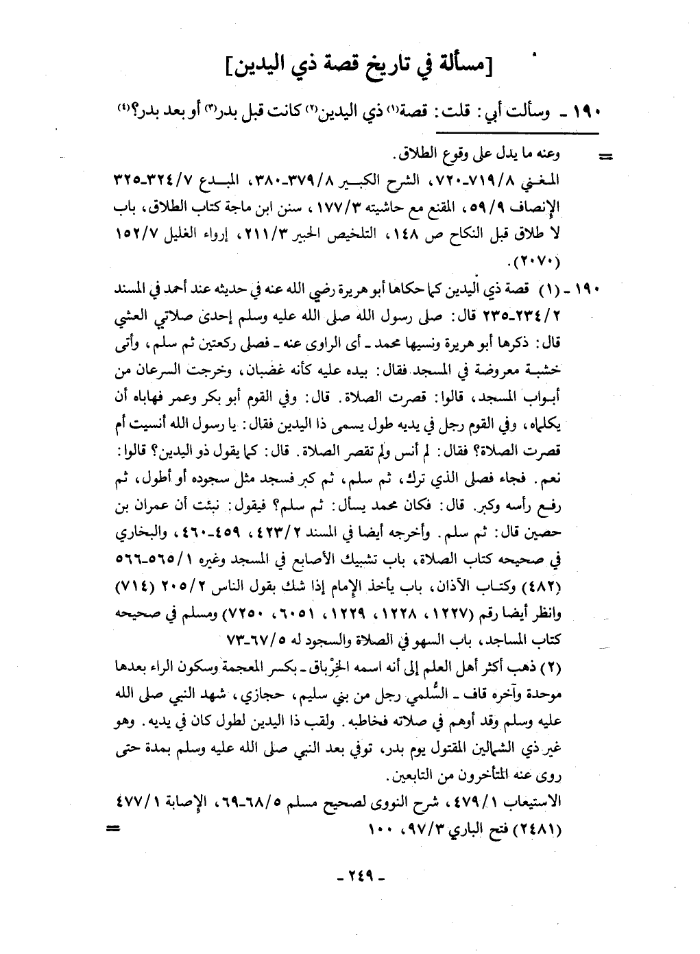 190 - وَسَأَلت أبي قلت قصَّة ذِي الْيَدَيْنِ كَانَت قبل بدر أَو بعد بدر