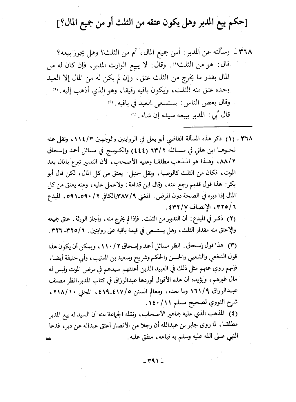 368 - وَسَأَلته عَن الْمُدبر أَمن جَمِيع المَال أم من الثُّلُث وَهل يجوز بَيْعه قَالَ هُوَ من الثُّلُث وَقَالَ لَا يَبِيع الْوَارِث الْمُدبر فَإِن كَانَ لَهُ من المَال بِقدر مَا يخرج من الثُّلُث عتق وَإِن لم يكن لَهُ من المَال إِلَّا العَبْد وَحده عتق مِنْهُ الثُّلُث وَيكون بَاقِيه رَقِيقا وَهُوَ الَّذِي أذهب إِلَيْهِ وَقَالَ بعض النَّاس يستسعى العَبْد فِي بَاقِيه قَالَ أبي الْمُدبر يَبِيعهُ سَيّده إِن شَاءَ