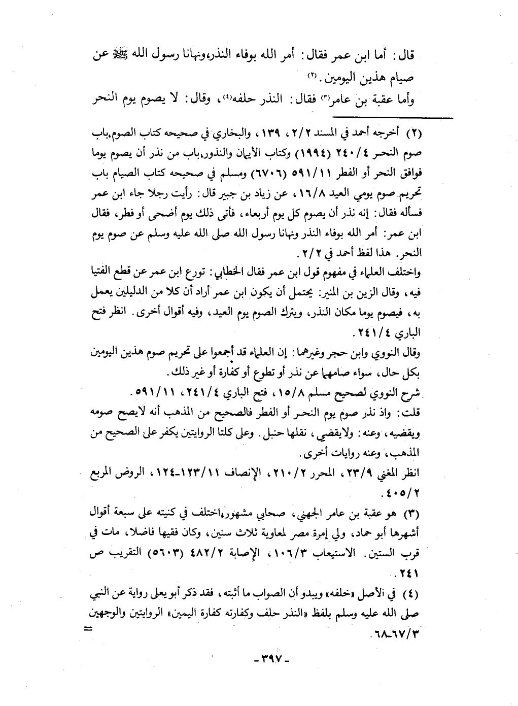 قَالَ أما ابْن عمر فَقَالَ أَمر الله بوفاء النّذر ونهانا رَسُول الله صلى الله عَلَيْهِ وَسلم عَن صِيَام هذَيْن الْيَوْمَيْنِ وَأما عقبَة بن عَامر فَقَالَ النّذر حلفه وَقَالَ لَا يَصُوم يَوْم النَّحْر