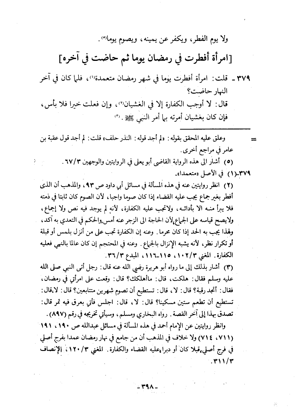 379 - قلت امْرَأَة أفطرت يَوْمًا فِي شهر رَمَضَان متعمدة فَلَمَّا كَانَ فِي آخر النَّهَار حَاضَت قَالَ لَا أوجب الْكَفَّارَة إِلَّا فِي الغشيان وَإِن فعلت خيرا فَلَا بَأْس فَإِن كَانَ بغشيان أَمرته بِمَا أَمر النَّبِي صلى الله عَلَيْهِ وَسلم