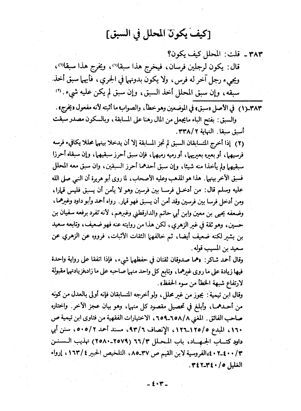 383 - قلت الْمُحَلّل كَيفَ يكون قَالَ يكون لِرجلَيْنِ فرسَان فَيخرج هَذَا سبقا وَيخرج هَذَا سبقا وَيَجِيء رجل آخر لَهُ فرس وَلَا يكون بدونهما فِي الجري فَأَيّهمَا سبق أَخذ سبقه وَإِن سبق الْمُحَلّل أَخذ السَّبق وَإِن سبق لم يكن عَلَيْهِ شَيْء