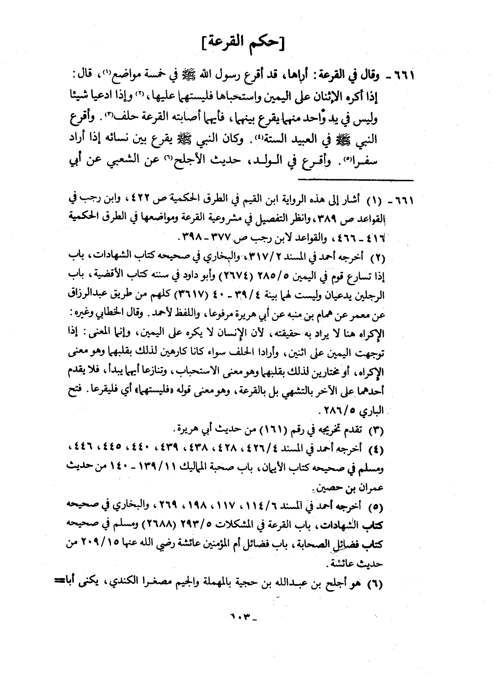 661 - وَقَالَ فِي الْقرعَة أَرَاهَا قد أَقرع رَسُول الله صلى الله عَلَيْهِ وَسلم فِي خَمْسَة مَوَاضِع قَالَ إِذا أكره الإثنان على الْيَمين واستحباها فليستهما عَلَيْهَا وَإِذا ادّعَيَا شَيْئا وَلَيْسَ فِي يَد وَاحِد مِنْهُمَا يقرع بَينهمَا فَأَيّهمَا أَصَابَته الْقرعَة حلف وأقرع النَّبِي صلى الله عَلَيْهِ وَسلم فِي العبيد السِّتَّة وَكَانَ النَّبِي صلى الله عَلَيْهِ وَسلم يقرع بَين نِسَائِهِ إِذا أَرَادَ سفرا وأقرع فِي الْوَلَد حَدِيث الْأَجْلَح عَن الشّعبِيّ عَن أبي