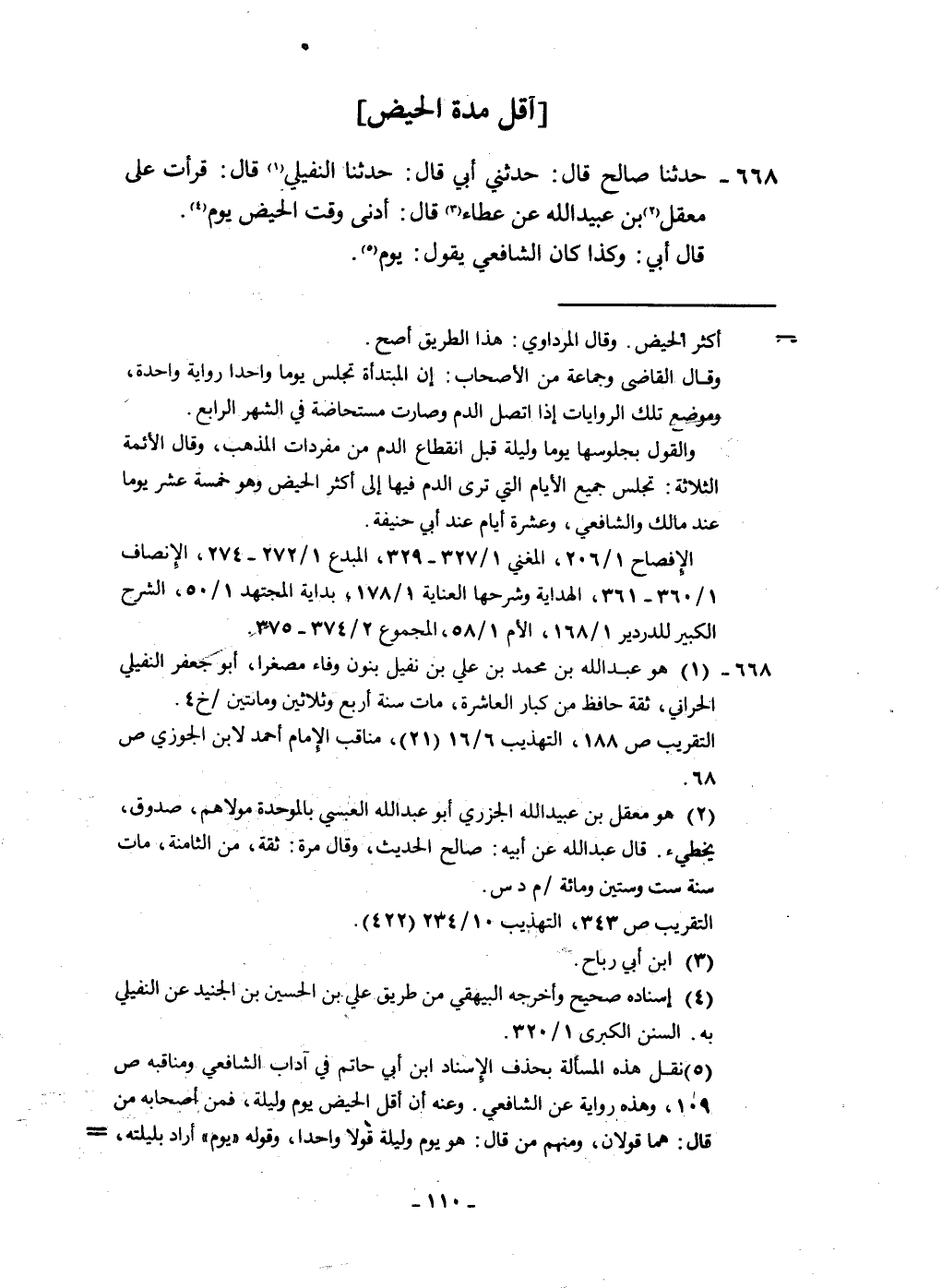 668 - حَدثنَا صَالح قَالَ حَدثنِي أبي قَالَ حَدثنَا النُّفَيْلِي قَالَ قَرَأت على معقل بن عبيد الله عَن عَطاء قَالَ أدنى وَقت الْحيض يَوْم قَالَ أبي وَكَذَا كَانَ الشَّافِعِي يَقُول يَوْم