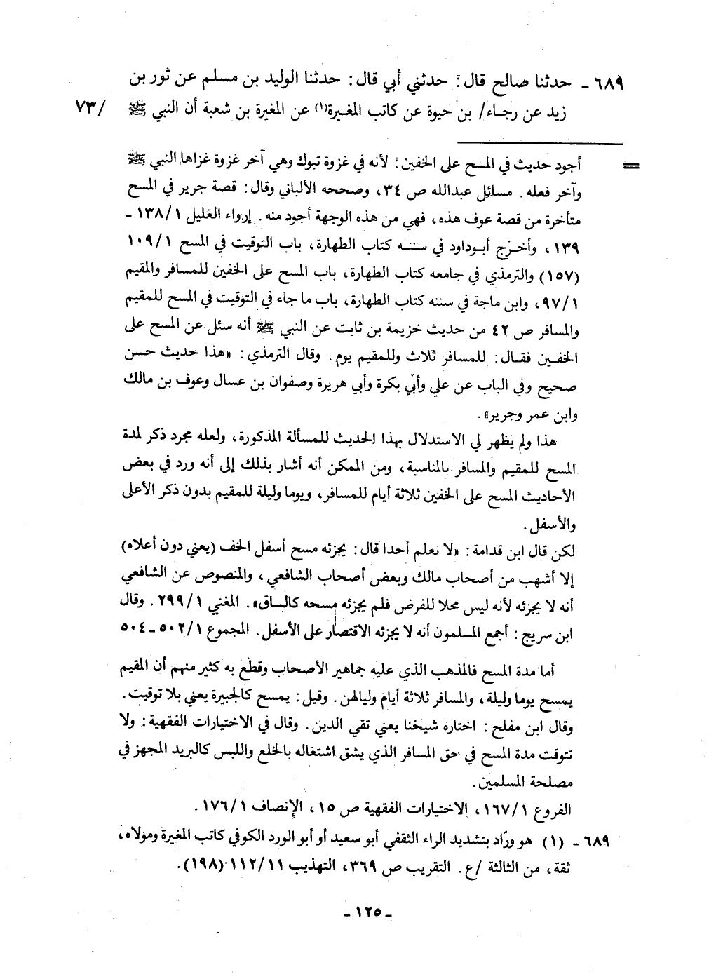 689 - حَدثنَا صَالح قَالَ حَدثنِي أبي قَالَ حَدثنَا الْوَلِيد بن مُسلم عَن ثَوْر بن زيد عَن رَجَاء بن حَيْوَة عَن كَاتب الْمُغيرَة عَن الْمُغيرَة بن شُعْبَة أَن النَّبِي صلى الله عَلَيْهِ وَسلم