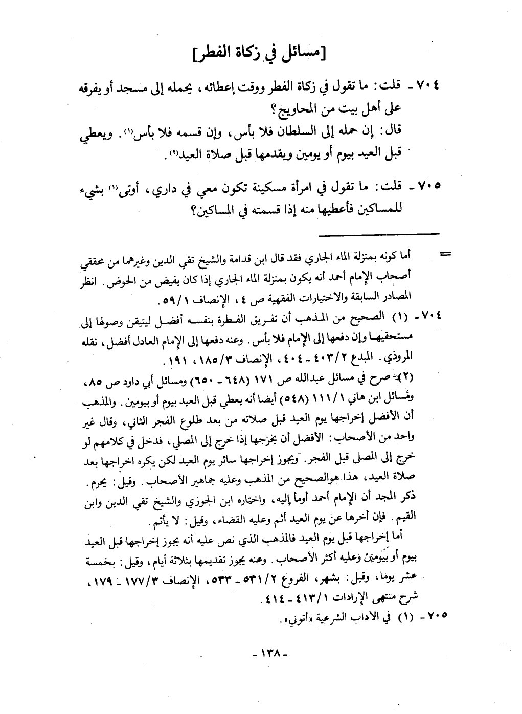 704 - قلت مَا تَقول فِي زَكَاة الْفطر وَوقت إِعْطَائِهِ يحملهُ إِلَى مَسْجِد أَو يفرقه على أهل بَيت من المحاويج قَالَ إِن حمله إِلَى السُّلْطَان فَلَا بَأْس وَإِن قسمه فَلَا بَأْس وَيُعْطِي قبل الْعِيد بِيَوْم اَوْ يَوْمَيْنِ ويقدمها قبل صَلَاة الْعِيد