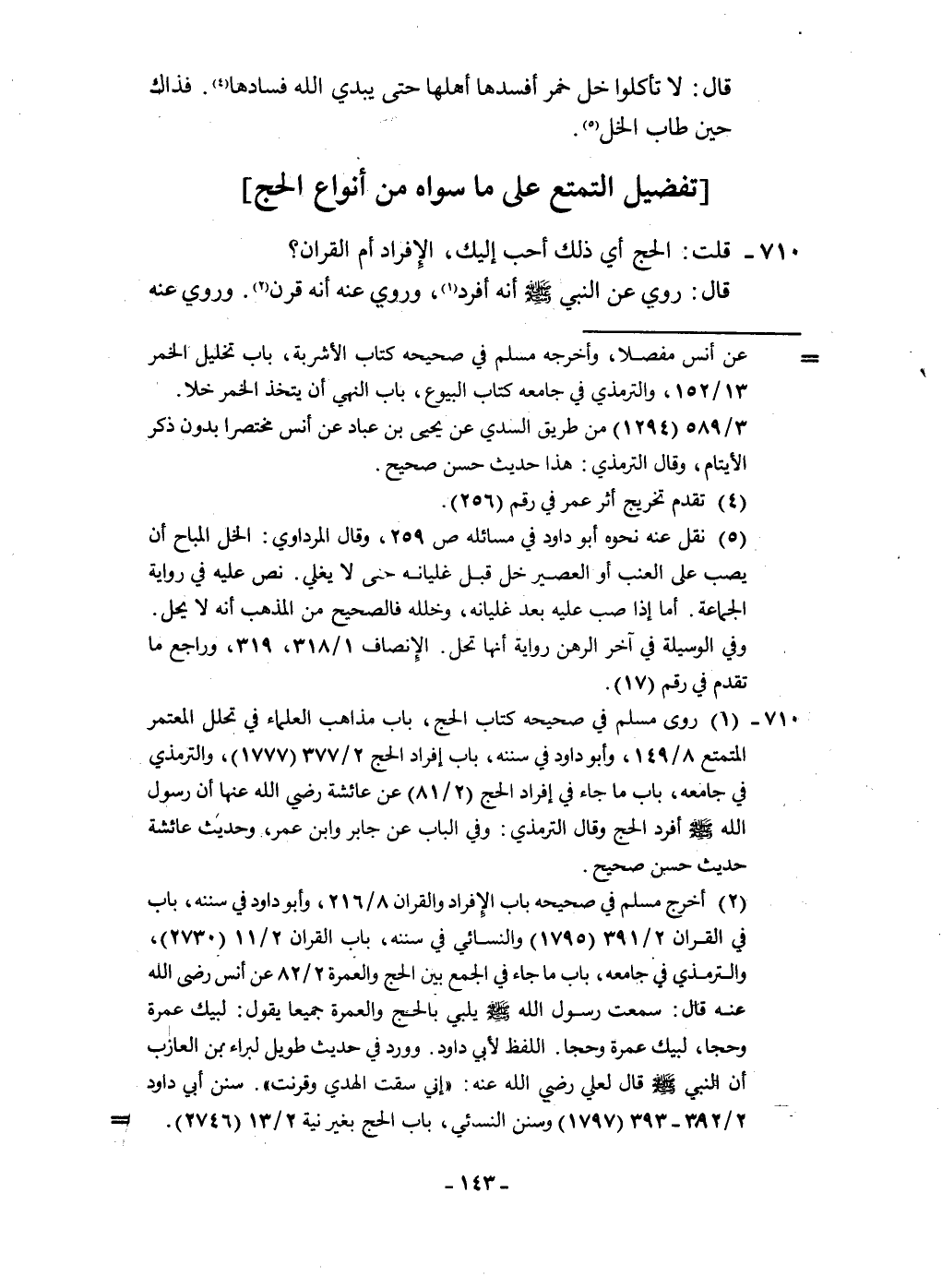 710 - قلت الْحَج أَي ذَلِك أحب إِلَيْك الْإِفْرَاد أم الْقرَان قَالَ رُوِيَ عَن النَّبِي صلى الله عَلَيْهِ وَسلم أَنه أفرد وَرُوِيَ عَنهُ أَنه قرن وَرُوِيَ عَنهُ