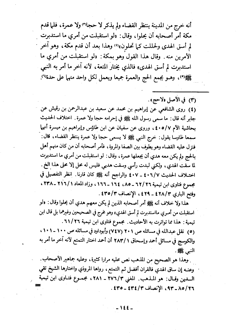 أَنه خرج من الْمَدِينَة ينْتَظر الْقَضَاء وَلم يذكر لَا حجا وَلَا عمْرَة فَلَمَّا قدم مَكَّة أَمر أَصْحَابه أَن يحلوا وَقَالَ لَو اسْتقْبلت من أَمْرِي مَا اسْتَدْبَرت وَلم أسق الْهدى ولحللت كَمَا تحِلُّونَ وَهَذَا بعد أَن قدم مَكَّة وَهُوَ آخر الْأَمريْنِ مِنْهُ وَقَالَ هَذَا القَوْل وَهُوَ بِمَكَّة لَو اسْتقْبلت من أَمْرِي مَا اسْتَدْبَرت لم أسق الْهدى فَالَّذِي يخْتَار الْمُتْعَة لِأَنَّهُ آخر مَا أَمر بِهِ النَّبِي صلى الله عَلَيْهِ وَسلم وَهُوَ يجمع الْحَج وَالْعمْرَة جَمِيعًا وَيعْمل لكل وَاحِد مِنْهُمَا على حِدة