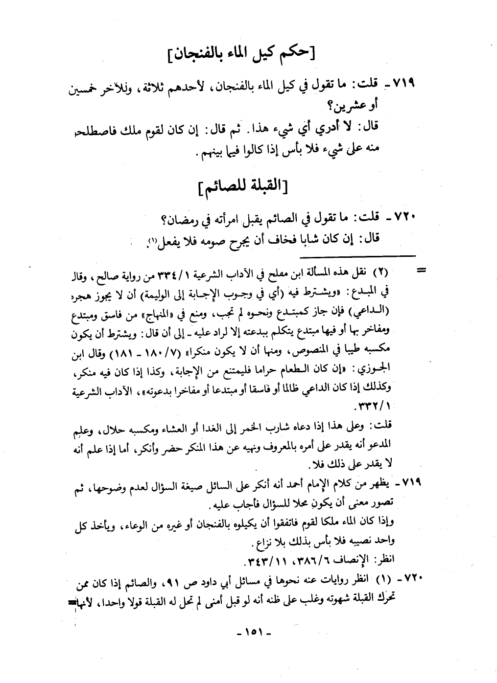 719 - قلت مَا تَقول فِي كيل المَاء بالفنجان لأَحَدهم ثَلَاثَة وَللْآخر خمسين أَو عشْرين قَالَ لَا أَدْرِي أَي شَيْء هَذَا ثمَّ قَالَ إِن كَانَ لقوم ملك فَاصْطَلَحُوا مِنْهُ على شَيْء فَلَا بَأْس إِذا كالوا فِيمَا بَينهم