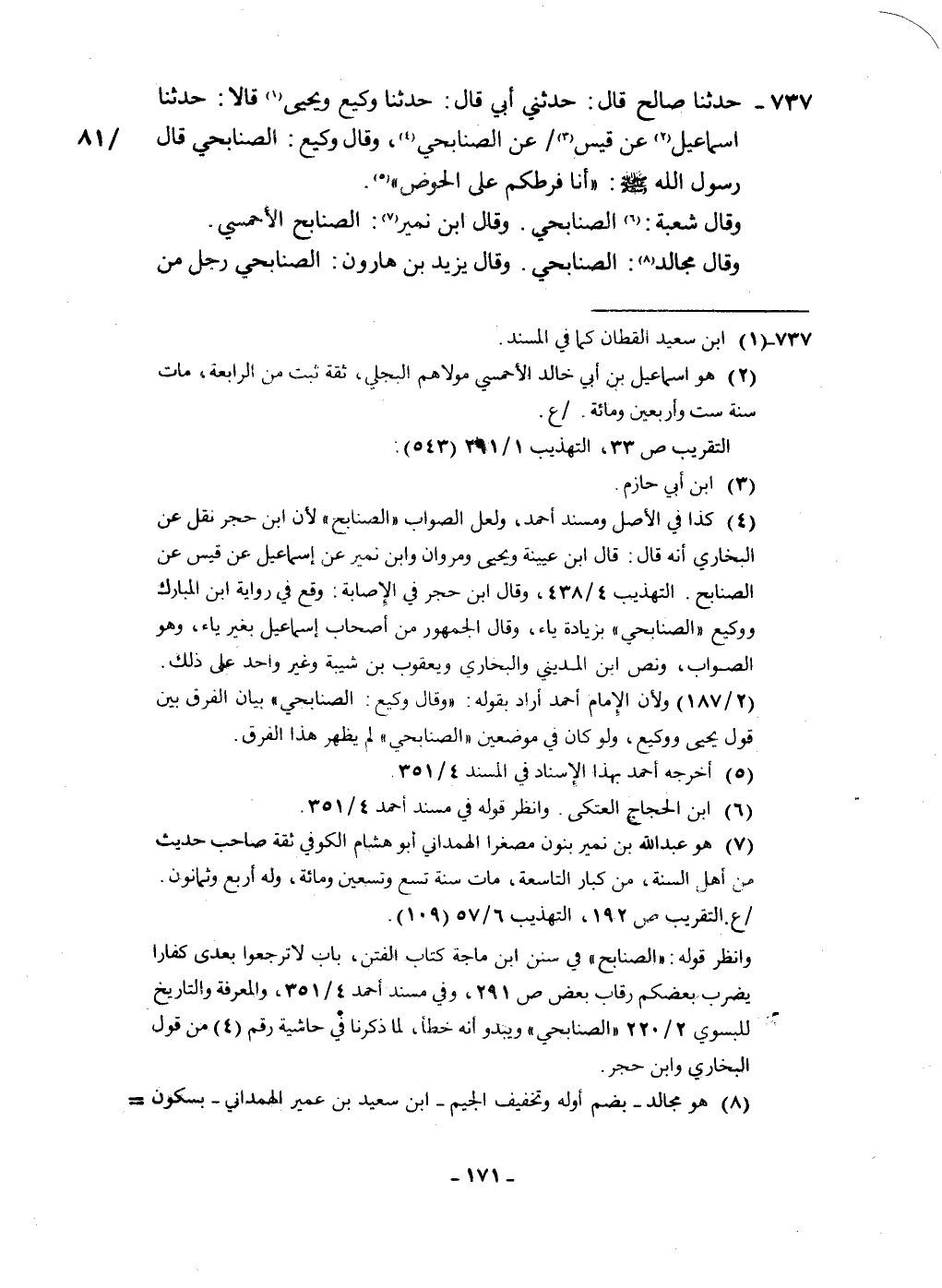 737 - حَدثنَا صَالح قَالَ حَدثنِي أبي قَالَ حَدثنَا وَكِيع وَيحيى قَالَا حَدثنَا اسماعيل عَن قيس عَن الصنَابحِي وَقَالَ وَكِيع الصنَابحِي قَالَ رَسُول الله صلى الله عَلَيْهِ وَسلم أَنا فَرَطكُمْ على الْحَوْض وَقَالَ شُعْبَة الصنَابحِي وَقَالَ ابْن نمير الصنَابحِي الأحمسي وَقَالَ مجَالد الصنَابحِي وَقَالَ يزِيد بن هَارُون الصنَابحِي رجل من