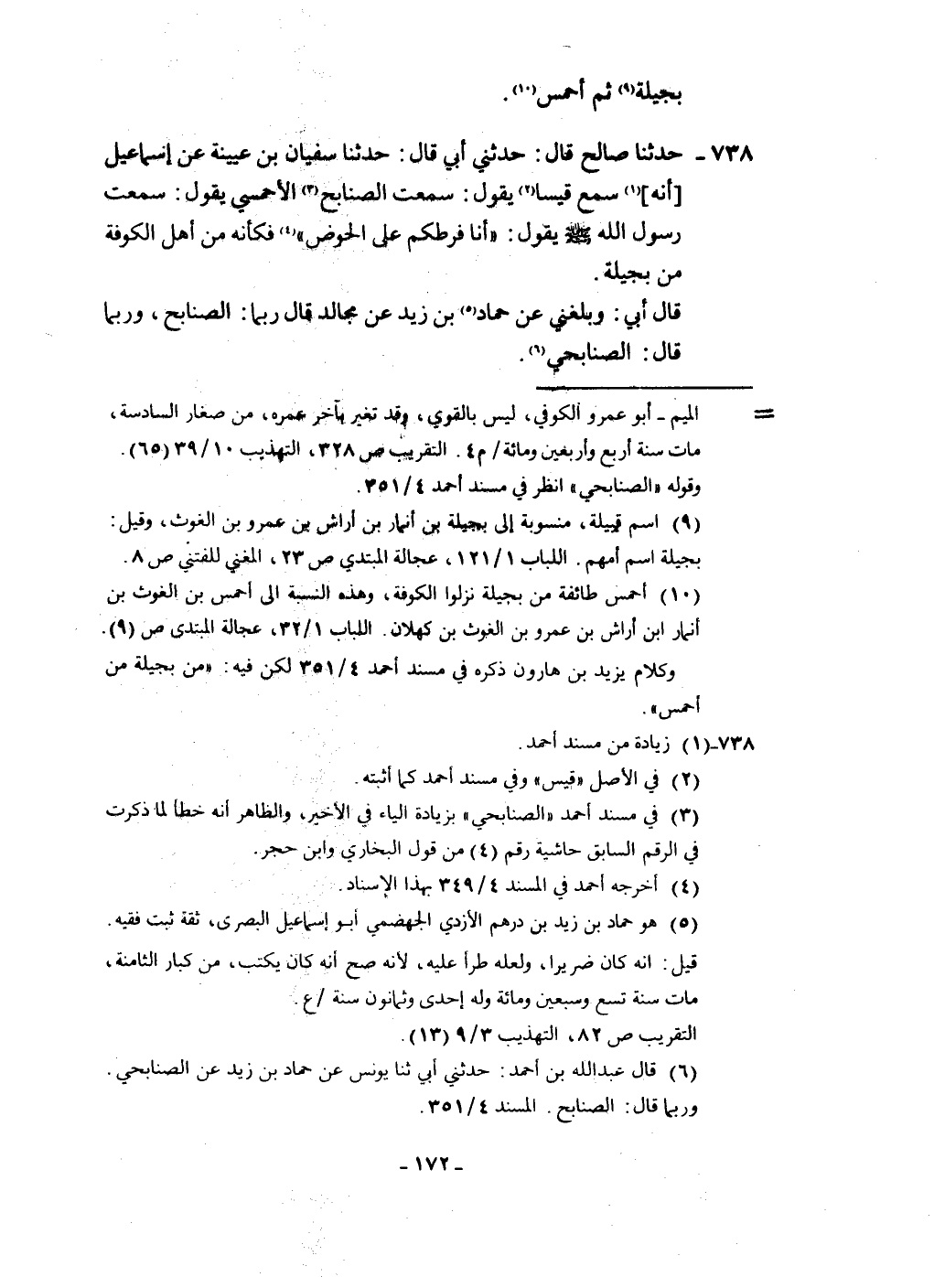 738 - حَدثنَا صَالح قَالَ حَدثنِي أبي قَالَ حَدثنَا سُفْيَان بن عُيَيْنَة عَن إِسْمَاعِيل أَنه سمع قيسا يَقُول سَمِعت الصنابح الأحمسي يَقُول سَمِعت رَسُول الله صلى الله عَلَيْهِ وَسلم يَقُول أَنا فَرَطكُمْ على الْحَوْض فَكَأَنَّهُ من أهل الْكُوفَة من بجيلة قَالَ أبي وَبَلغنِي عَن حَمَّاد بن زيد عَن مجَالد قَالَ رُبمَا الصنابح وَرُبمَا قَالَ الصنَابحِي