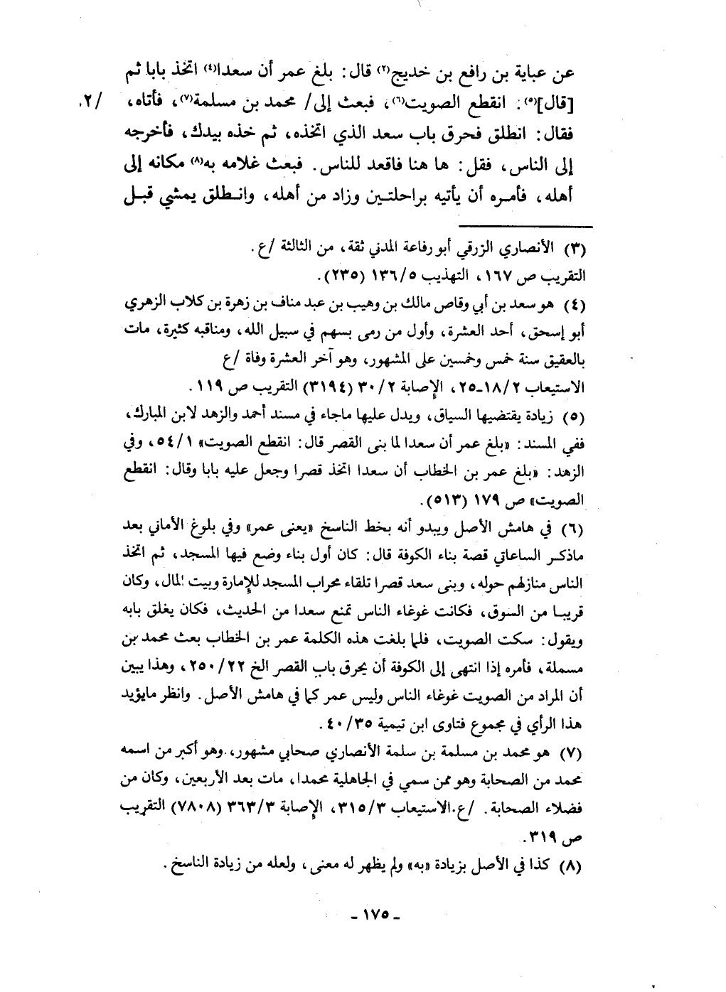 عَن عَبَايَة بن رَافع بن خديج قَالَ بلغ عمر أَن سَعْدا اتخذ بَابا ثمَّ قَالَ انْقَطع الصويت فَبعث إِلَيّ مُحَمَّد بن مسلمة فَأَتَاهُ فَقَالَ انْطلق فَحرق بَاب سعد الَّذِي اتَّخذهُ ثمَّ خُذْهُ بِيَدِك فَأخْرجهُ إِلَى النَّاس فَقل هَاهُنَا فَاقْعُدْ النَّاس فَبعث غُلَامه بِهِ مَكَانَهُ إِلَى أَهله فَأمره أَن يَأْتِيهِ براحلتين وَزَاد من أَهله وَانْطَلق يمشي قبل