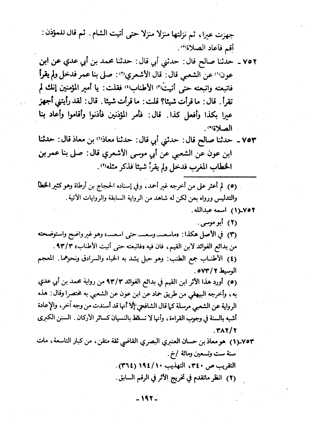752 - حَدثنَا صَالح قَالَ حَدثنِي أبي قَالَ حَدثنَا مُحَمَّد بن أبي عدي عَن ابْن عون عَن الشّعبِيّ قَالَ قَالَ الْأَشْعَرِيّ صلى بِنَا عمر فَدخل وَلم يقْرَأ فاتبعته واتبعته حَتَّى أتيت الْأَطْنَاب فَقلت يَا أَمِير الْمُؤمنِينَ إِنَّك لم تقْرَأ قَالَ مَا قَرَأت شَيْئا قلت مَا قَرَأت شَيْئا قَالَ لقد رَأَيْتنِي أجهز عيرًا بِكَذَا وأفعل كَذَا قَالَ فَأمر المؤذنين فأذنوا وَأَقَامُوا وَأعَاد بِنَا الصَّلَاة