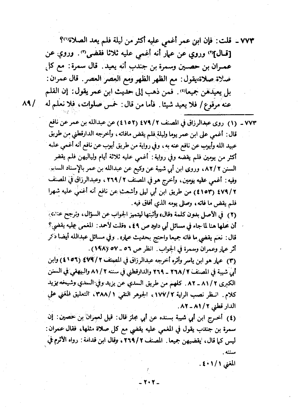 773 - قلت فَإِن ابْن عمر أُغمي عَلَيْهِ أَكثر من لَيْلَة فَلم يعد الصَّلَاة قَالَ وَرُوِيَ عَن عمار أَنه أُغمي عَلَيْهِ ثَلَاثًا فَقضى وَرُوِيَ عَن عمرَان بن حُصَيْن وَسمرَة بن جُنْدُب أَنه يُعِيد قَالَ سَمُرَة مَعَ كل صَلَاة صَلَاة يَقُول مَعَ الظّهْر الظّهْر وَمَعَ الْعَصْر الْعَصْر قَالَ عمرَان بل يعيدهن جَمِيعًا فَمن ذهب إِلَى حَدِيث ابْن عمر يَقُول إِن الْقَلَم عَنهُ مَرْفُوع فَلَا يُعِيد شَيْئا فَأَما من قَالَ خمس صلوَات فَلَا نعلم لَهُ