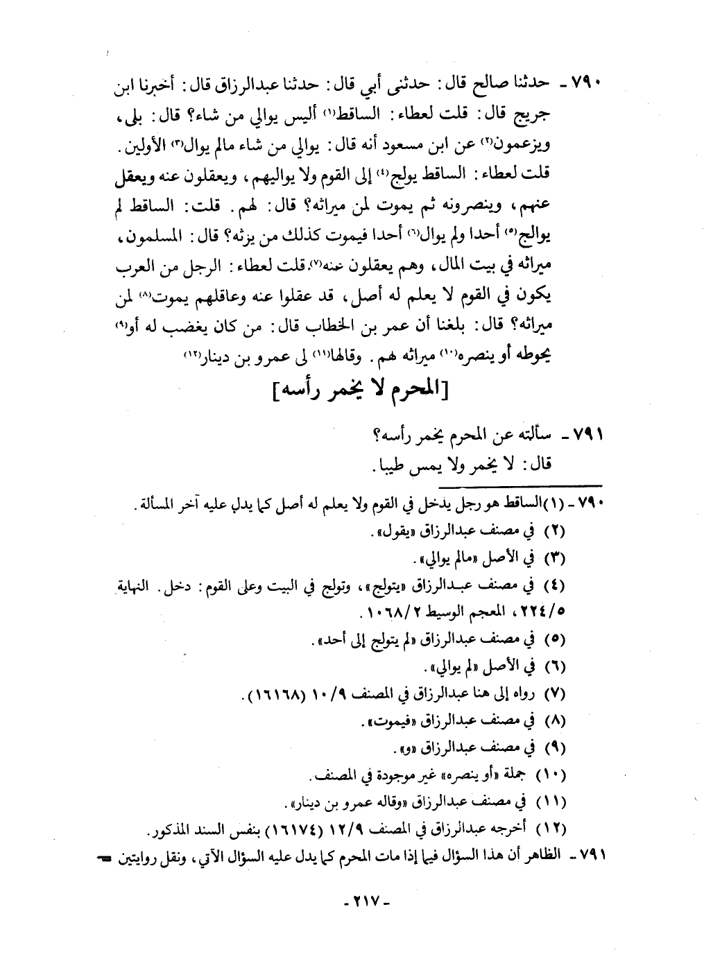 790 - حَدثنَا صَالح قَالَ حَدثنِي أبي قَالَ حَدثنَا عبد الرَّزَّاق قَالَ أخبرنَا ابْن جريج قَالَ قلت لعطاء السَّاقِط أَلَيْسَ يوالي من شَاءَ قَالَ بلَى ويزعمون عَن ابْن مَسْعُود أَنه قَالَ يوالي من شَاءَ مالم يوال الْأَوَّلين قلت لعطاء السَّاقِط يولج إِلَى الْقَوْم وَلَا يواليهم ويعقلون عَنهُ وَيعْقل عَنْهُم وينصرونه ثمَّ يَمُوت لمن مِيرَاثه قَالَ لَهُم قلت السَّاقِط لم يوالج أحدا وَلم يوال أحدا فَيَمُوت كَذَلِك من يَرِثهُ قَالَ الْمُسلمُونَ مِيرَاثه فِي بَيت المَال وهم يعْقلُونَ عَنهُ قلت لعطاء الرجل من الْعَرَب يكون فِي الْقَوْم لَا يعلم لَهُ أصل قد عقلوا عَنهُ وعاقلهم يَمُوت لمن مِيرَاثه قَالَ بلغنَا أَن عمر بن الْخطاب قَالَ من كَانَ يغْضب لَهُ أَو يحوطه أَو ينصره مِيرَاثه لَهُم وَقَالَهَا لى عَمْرو بن دِينَار