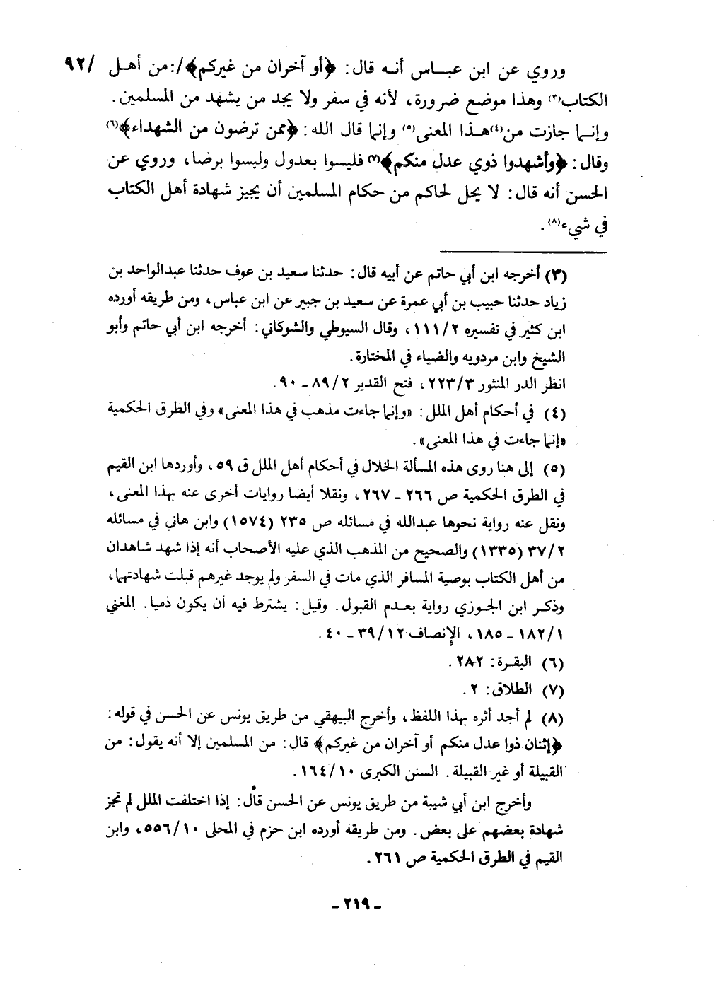 وَرُوِيَ عَن ابْن عَبَّاس أَنه قَالَ {أَو آخرَانِ من غَيْركُمْ} من أهل الْكتاب وَهَذَا مَوضِع ضَرُورَة لِأَنَّهُ فِي سفر وَلَا يجد من يشْهد من الْمُسلمين وَإِنَّمَا جَازَت من هَذَا الْمَعْنى وَإِنَّمَا قَالَ الله {مِمَّن ترْضونَ من الشُّهَدَاء} وَقَالَ {وَأشْهدُوا ذَوي عدل مِنْكُم} فليسوا بعدول وَلَيْسوا بِرِضا وَرُوِيَ عَن الْحسن أَنه قَالَ لَا يحل لحَاكم من حكام الْمُسلمين أَن يجييز شَهَادَة أهل الْكتاب فِي شَيْء