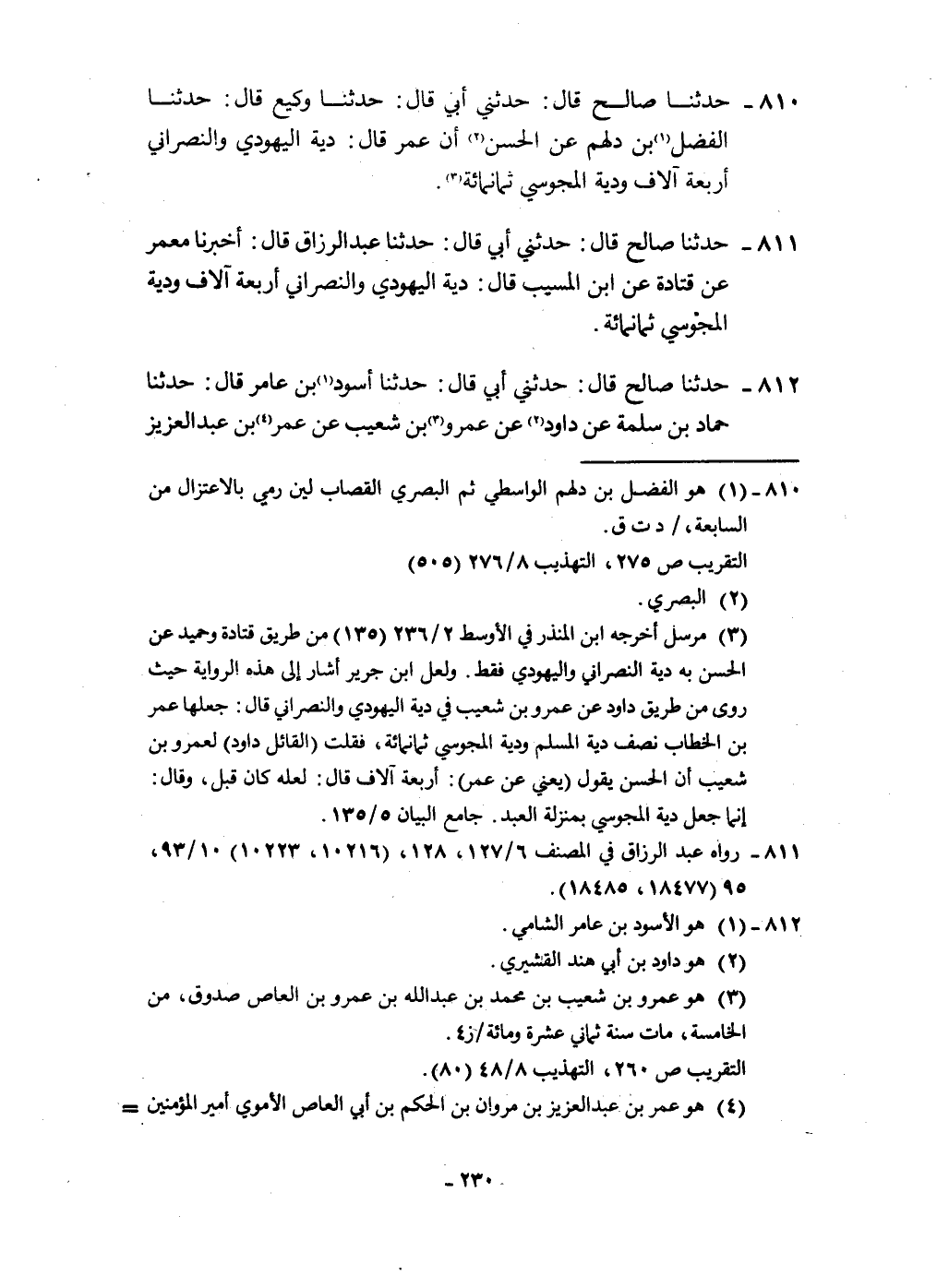 811 - حَدثنَا صَالح قَالَ حَدثنِي أبي قَالَ حَدثنَا عبد الرَّزَّاق قَالَ أخبرنَا معمر عَن قَتَادَة عَن ابْن الْمسيب قَالَ دِيَة الْيَهُودِيّ وَالنَّصْرَانِيّ أَرْبَعَة آلَاف ودية الْمَجُوسِيّ ثَمَانمِائَة