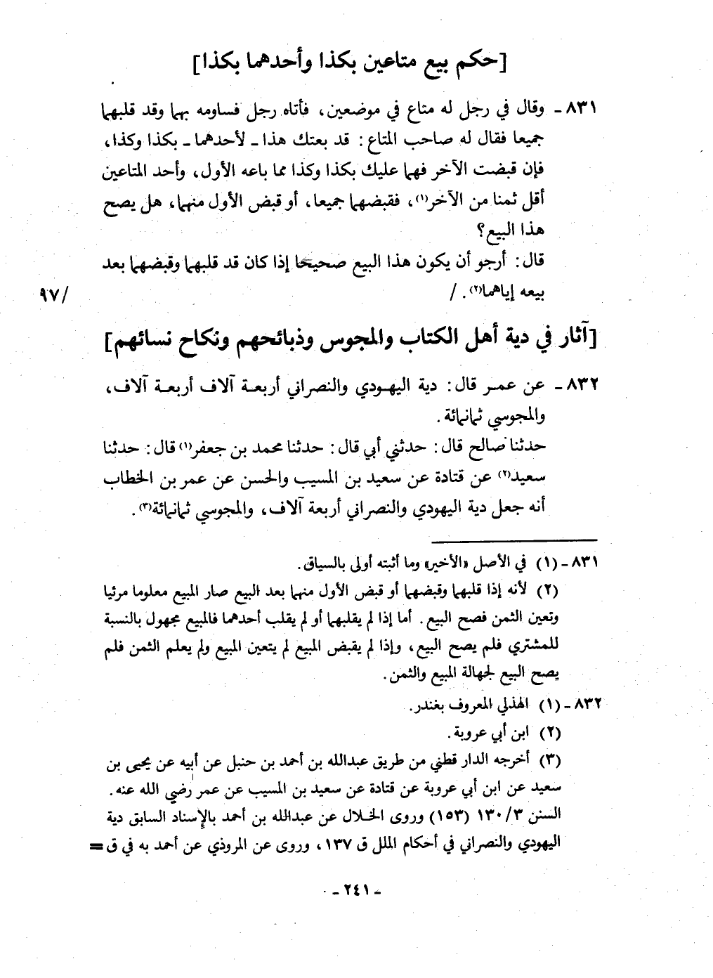 832 - عَن عمر قَالَ دِيَة الْيَهُودِيّ وَالنَّصْرَانِيّ أَرْبَعَة آلَاف أَرْبَعَة آلَاف والمجوسي ثَمَانمِائَة حَدثنَا صَالح قَالَ حَدثنِي أبي قَالَ حَدثنَا مُحَمَّد بن جَعْفَر قَالَ حَدثنَا سعيد عَن قَتَادَة عَن سعيد بن الْمسيب وَالْحسن عَن عمر بن الْخطاب أَنه جعل دِيَة الْيَهُودِيّ وَالنَّصْرَانِيّ أَرْبَعَة آلَاف والمجوسي ثَمَانمِائَة