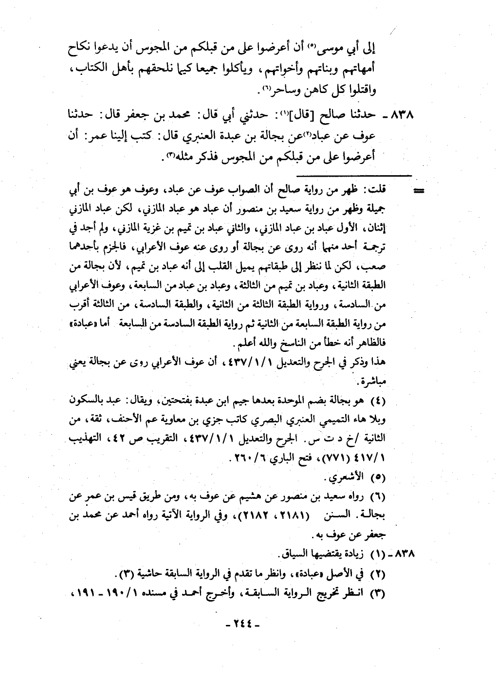 838 - حَدثنَا صَالح قَالَ حَدثنِي أبي قَالَ مُحَمَّد بن جَعْفَر قَالَ حَدثنَا عَوْف عَن عباد عَن بجالة بن عَبدة الْعَنْبَري قَالَ كتب إِلَيْنَا عمر أَن أَعرضُوا على من قبلكُمْ من الْمَجُوس فَذكر مثله