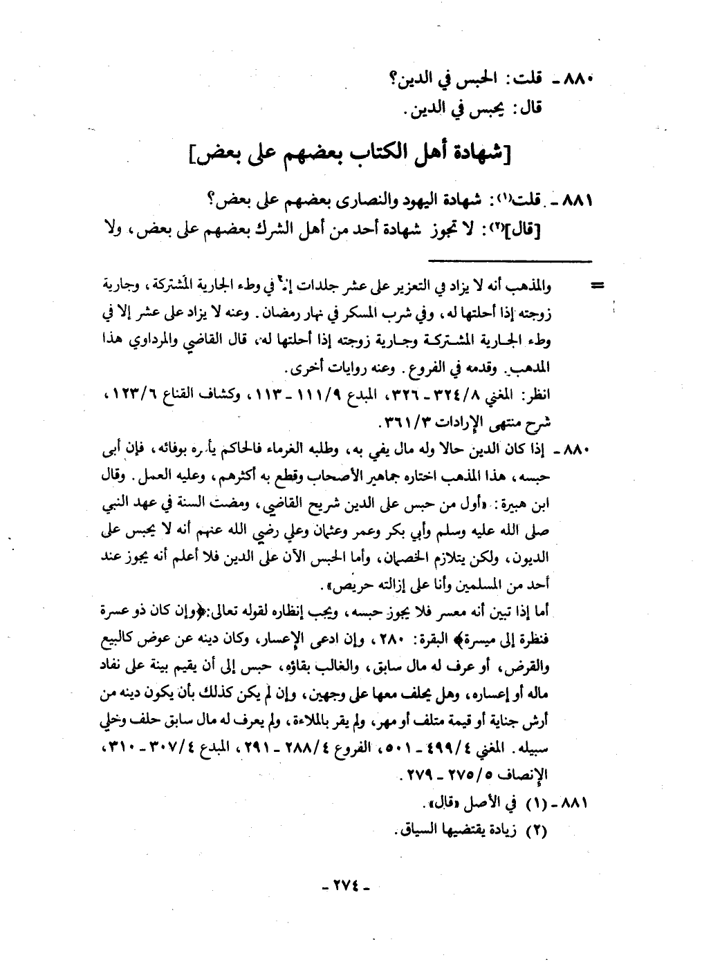 881 - قلت شَهَادَة الْيَهُود وَالنَّصَارَى بَعضهم على بعض قَالَ لَا تجوز شَهَادَة أحد من أهل الشّرك بَعضهم على بعض وَلَا