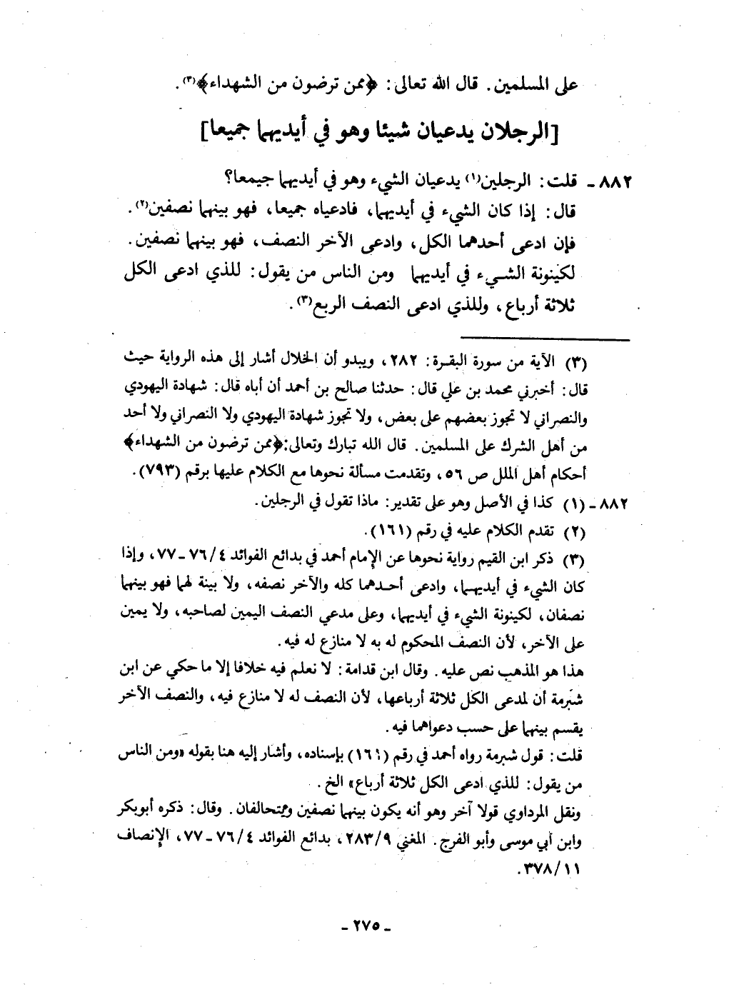 882 - قلت الرجلَيْن يدعيان الشَّيْء وَهُوَ فِي أَيْدِيهِمَا جَمِيعًا قَالَ إِذا كَانَ الشَّيْء فِي أَيْدِيهِمَا فادعياه جَمِيعًا فَهُوَ بَينهمَا نِصْفَيْنِ فَإِن ادّعى أَحدهمَا الْكل وَادّعى الآخر النّصْف فَهُوَ بَينهمَا نِصْفَيْنِ لكينونة الشَّيْء فِي أَيْدِيهِمَا وَمن النَّاس من يَقُول للَّذي ادّعى الْكل ثَلَاثَة أَربَاع وللذي ادّعى النّصْف الرّبع