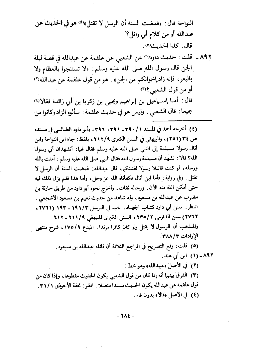 النواحة قَالَ فمضت السّنة أَن الرُّسُل لَا تقتل هُوَ فِي الحَدِيث عَن عبد الله أَو من كَلَام أبي وَائِل قَالَ كَذَا الحَدِيث