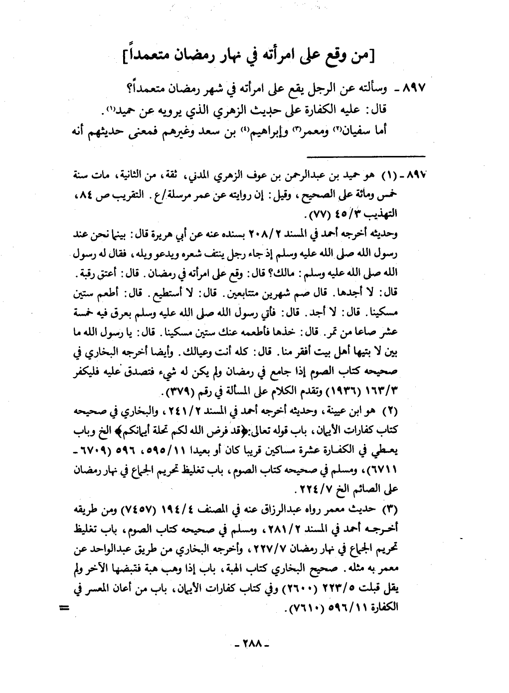 897 - وَسَأَلته عَن الرجل يَقع على امْرَأَته فِي شهر رَمَضَان مُتَعَمدا قَالَ عَلَيْهِ الْكَفَّارَة على حَدِيث الزُّهْرِيّ الَّذِي يرويهِ عَن حميد أما سُفْيَان وَمعمر وَإِبْرَاهِيم بن سعد وَغَيرهم فَمَعْنَى حَدِيثهمْ أَنه