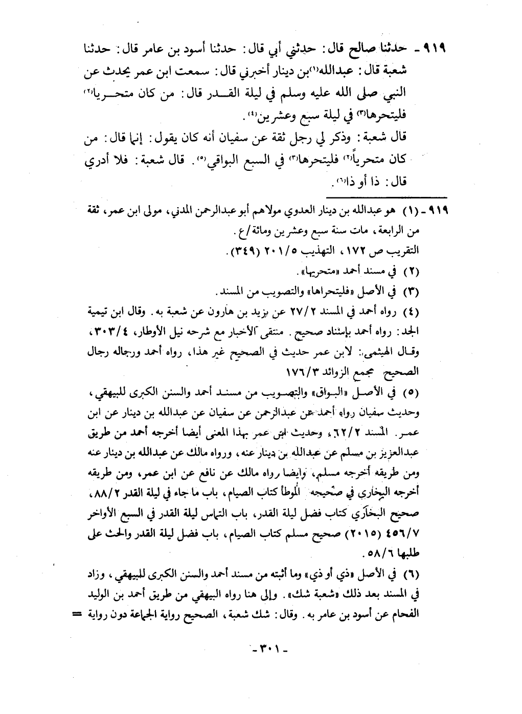 919 - حَدثنَا صَالح قَالَ حَدثنِي أبي قَالَ حَدثنَا أسود بن عَامر قَالَ حَدثنَا شُعْبَة قَالَ عبد الله بن دِينَار أَخْبرنِي قَالَ سَمِعت ابْن عمر يحدث عَن النَّبِي صلى الله عَلَيْهِ وَسلم فِي لَيْلَة الْقدر قَالَ من كَانَ متحريا فليتحرها فِي لَيْلَة سبع وَعشْرين قَالَ شُعْبَة وَذكر لي رجل ثِقَة عَن سُفْيَان أَنه كَانَ يَقُول إِنَّمَا قَالَ من كَانَ متحريا فليتحرها فِي السَّبع الْبَوَاقِي قَالَ شُعْبَة فَلَا أَدْرِي قَالَ ذَا أَو ذَا