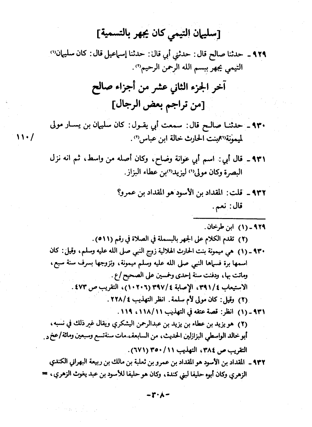 930 - حَدثنَا صَالح قَالَ سَمِعت أبي يَقُول كَانَ سُلَيْمَان بن يسَار مولى لميمونة بنت الْحَارِث خَالَة ابْن عَبَّاس