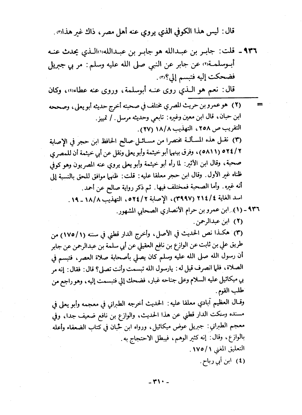 936 - قلت جَابر بن عبد الله هُوَ جَابر بن عبد الله الَّذِي يحدث عَنهُ أَبُو سَلمَة عَن جَابر عَن النَّبِي صلى الله عَلَيْهِ وَسلم مر بِي جِبْرِيل فَضَحكت إِلَيْهِ فَتَبَسَّمَ إِلَيّ قَالَ نعم هُوَ الَّذِي روى عَنهُ أَبُو سَلمَة وروى عَنهُ عَطاء وَكَانَ