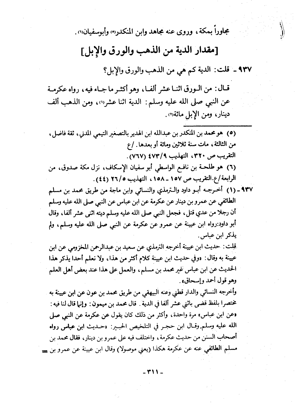 937 - قلت الدِّيَة كم هِيَ من الذَّهَب وَالْوَرق وَالْإِبِل قَالَ من الْوَرق اثْنَا عشر ألفا وَهُوَ أَكثر مَا جَاءَ فِيهِ رَوَاهُ عِكْرِمَة عَن النَّبِي صلى الله عَلَيْهِ وَسلم الدِّيَة اثْنَا عشر وَمن الذَّهَب ألف دِينَار وَمن الْإِبِل مائَة