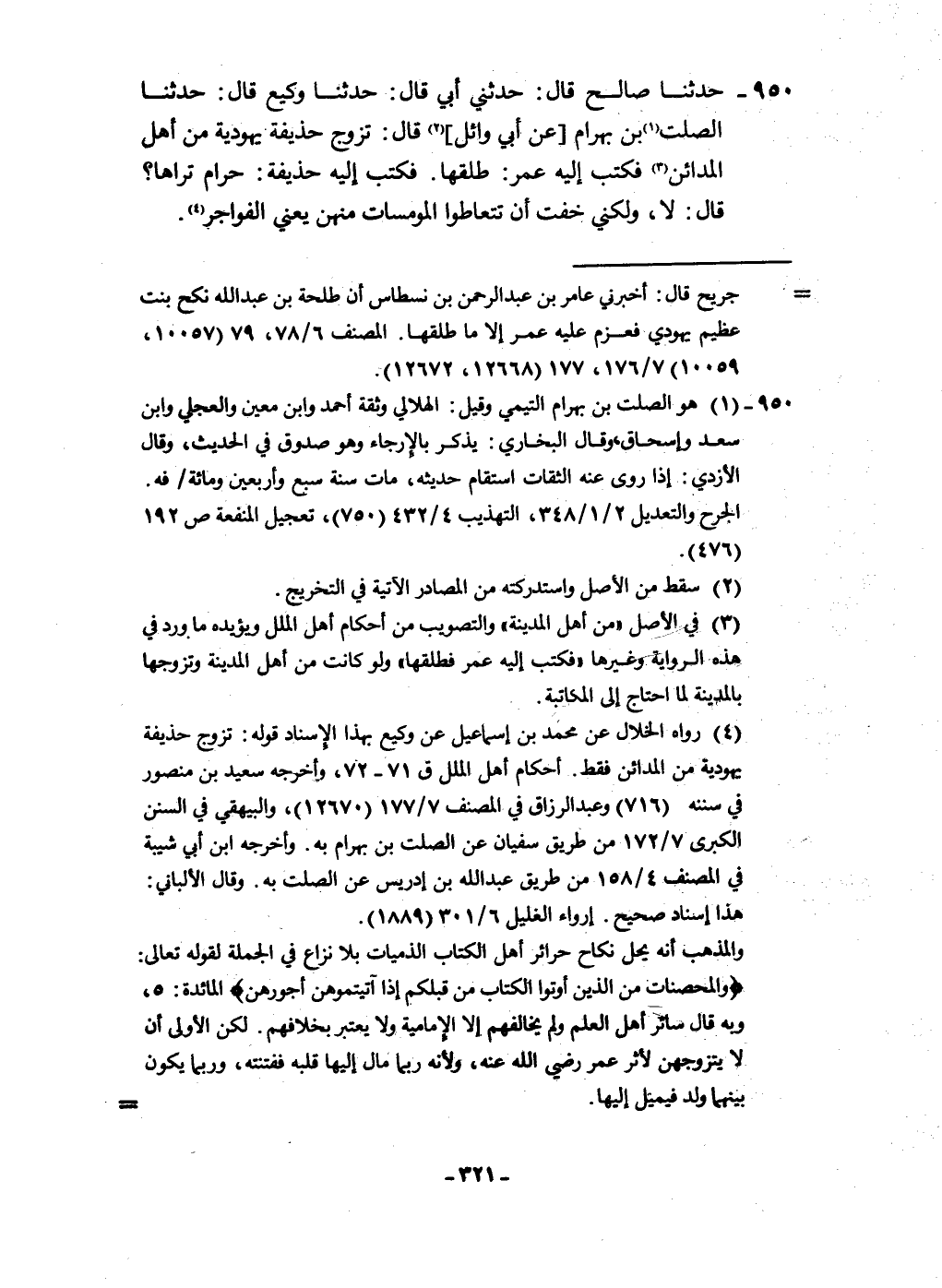 950 - حَدثنَا صَالح قَالَ حَدثنِي أبي قَالَ حَدثنَا وَكِيع قَالَ حَدثنَا الصَّلْت بن بهْرَام عَن أبي وَائِل قَالَ تزوج حُذَيْفَة يَهُودِيَّة من أهل الْمَدَائِن فَكتب إِلَيْهِ عمر طَلقهَا فَكتب إِلَيْهِ حُذَيْفَة حرَام ترَاهَا قَالَ لَا وَلَكِنِّي خفت أَن تتعاطوا المومسات مِنْهُنَّ يَعْنِي الفواجر