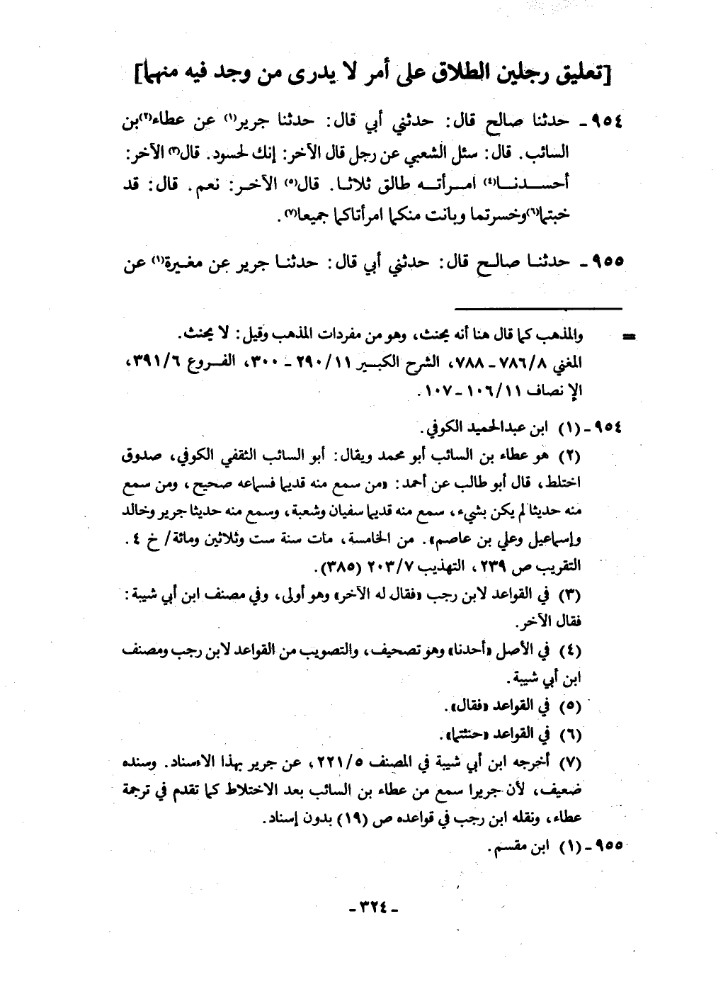 954 - حَدثنَا صَالح قَالَ حَدثنِي أبي قَالَ حَدثنَا جرير عَن عَطاء بن السَّائِب قَالَ سُئِلَ الشّعبِيّ عَن رجل قَالَ الآخر إِنَّك لحسود قَالَ الآخر أحسدنا امْرَأَته طَالِق ثَلَاثًا قَالَ الآخر نعم قَالَ قد خبتما وخسرتما وَبَانَتْ مِنْكُمَا امرأتاكما جَمِيعًا