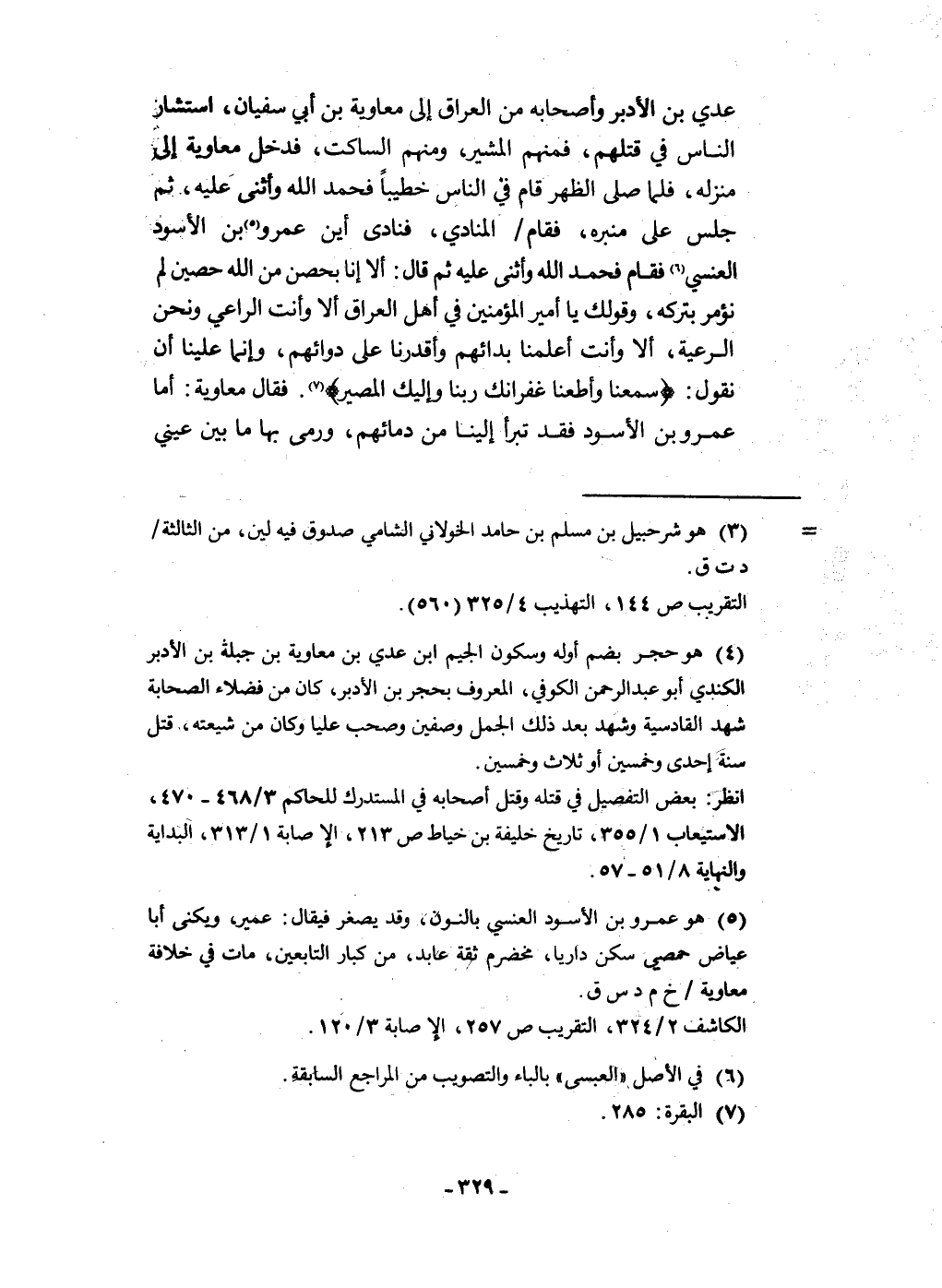عدي بن الأدبر وَأَصْحَابه من الْعرَاق إِلَى مُعَاوِيَة بن أبي سُفْيَان اسْتَشَارَ النَّاس فِي قَتلهمْ فَمنهمْ المشير وَمِنْهُم السَّاكِت فَدخل مُعَاوِيَة إِلَى منزله فَلَمَّا صلى الظّهْر قَامَ فِي النَّاس خَطِيبًا فَحَمدَ الله وَأثْنى عَلَيْهِ ثمَّ جلس على منبره فَقَامَ الْمُنَادِي فَنَادَى أَيْن عَمْرو بن الْأسود الْعَنسِي فَقَامَ فَحَمدَ الله وَأثْنى عَلَيْهِ ثمَّ قَالَ أَلا إِنَّا بحصن من الله حُصَيْن لم نؤمر بِتَرْكِهِ وقولك يَا أَمِير الْمُؤمنِينَ فِي أهل الْعرَاق أَلا وَأَنت الرَّاعِي وَنحن الرّعية أَلا وَأَنت أعلمنَا بدائهم وأقدرنا على دوائهم وَإِنَّمَا علينا أَن نقُول {سمعنَا وأطعنا غفرانك رَبنَا وَإِلَيْك الْمصير} فَقَالَ مُعَاوِيَة أما عَمْرو بن الْأسود فقد تَبرأ إِلَيْنَا من دِمَائِهِمْ وَرمى بهَا مَا بَين عَيْني