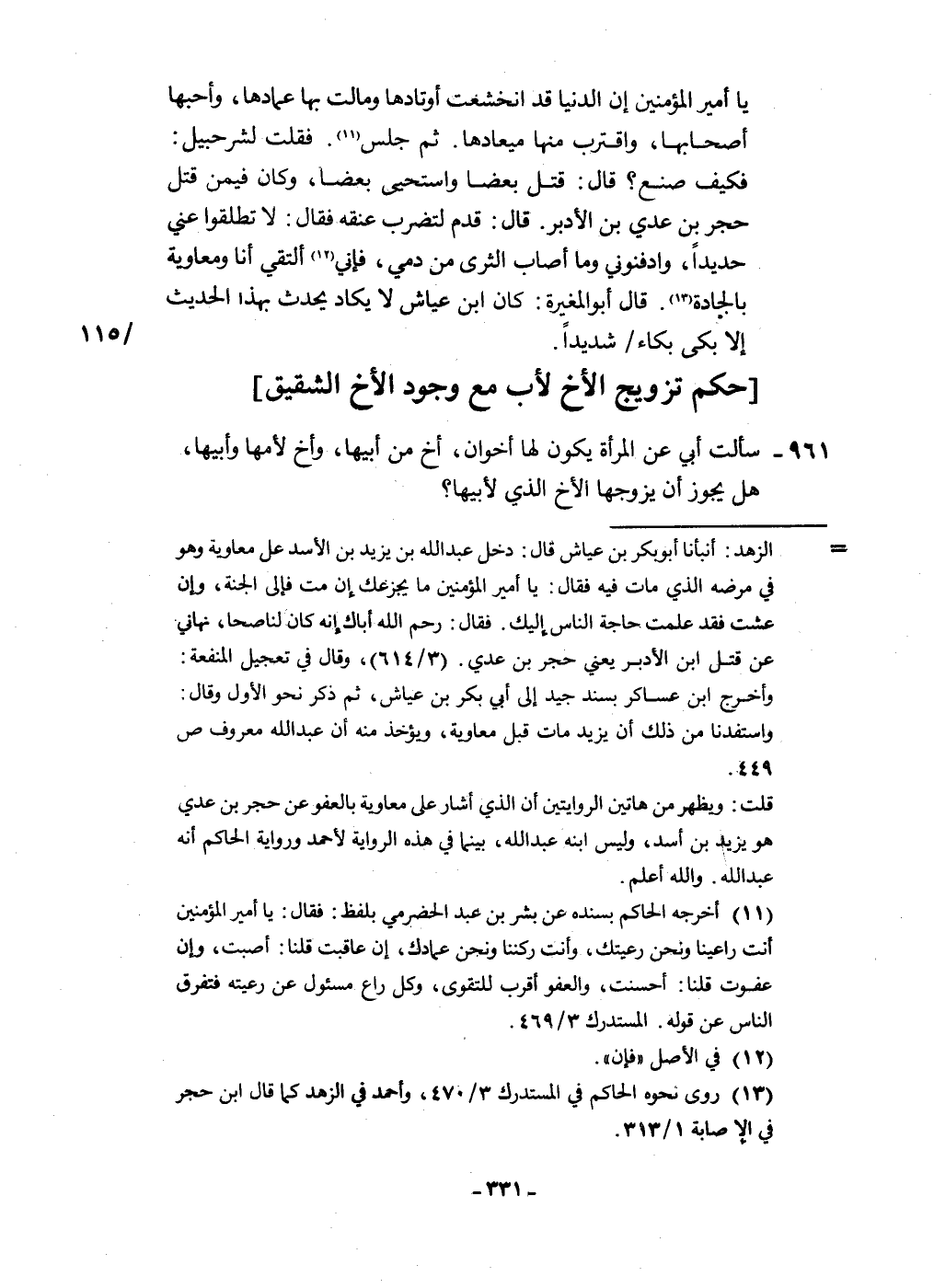 يَا أَمِير الْمُؤمنِينَ إِن الدُّنْيَا قد انخشعت أوتادها ومالت بهَا عمادها وأحبها أَصْحَابهَا واقترب مِنْهَا ميعادها ثمَّ جلس فَقلت لشرحبيل فَكيف صنع قَالَ قتل بَعْضًا واستحيى بَعْضًا وَكَانَ فِيمَن قتل حجر بن عدي بن الأدبر قَالَ قدم لتضرب عُنُقه فَقَالَ لَا تطلقوا عني حديدا وادفنوني وَمَا أصَاب الثرى من دمي فَإِنِّي ألتقي أَنا وَمُعَاوِيَة بالجادة قَالَ أَبُو الْمُغيرَة كَانَ ابْن عَيَّاش لَا يكَاد يحدث بِهَذَا الحَدِيث إِلَّا بَكَى بكاء شَدِيدا