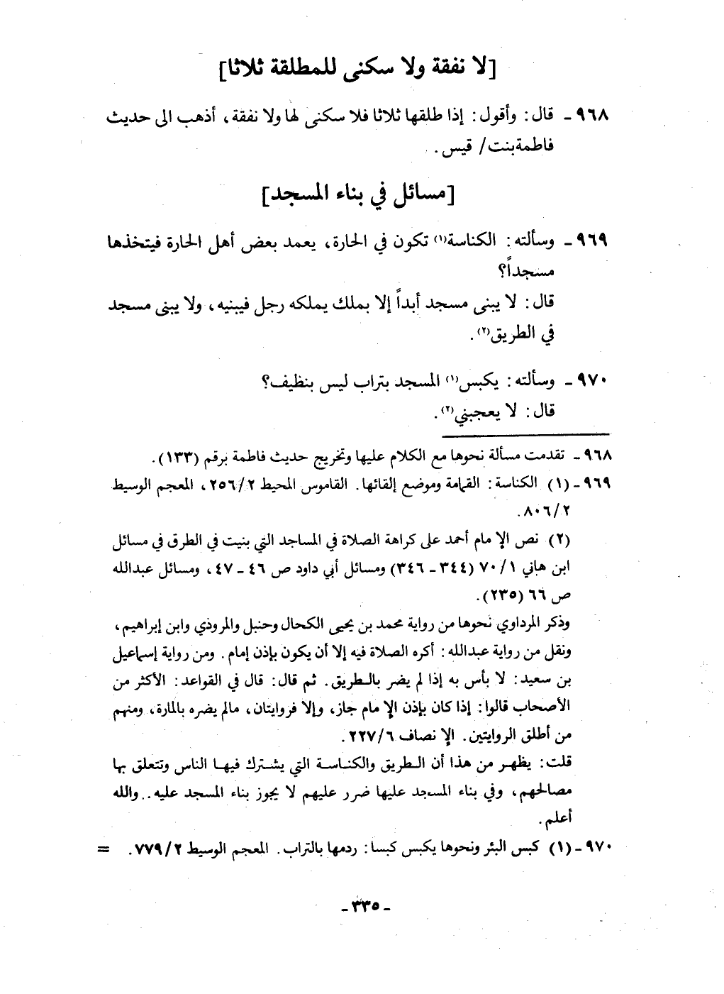 969 - وَسَأَلته الكناسة تكون فِي الحارة يعمد بعض أهل الحارة فيتخذها مَسْجِدا قَالَ لَا يبْنى مَسْجِدا أبدا إِلَّا بِملك يملكهُ رجل فيبنيه وَلَا يبْنى مَسْجِد فِي الطَّرِيق
