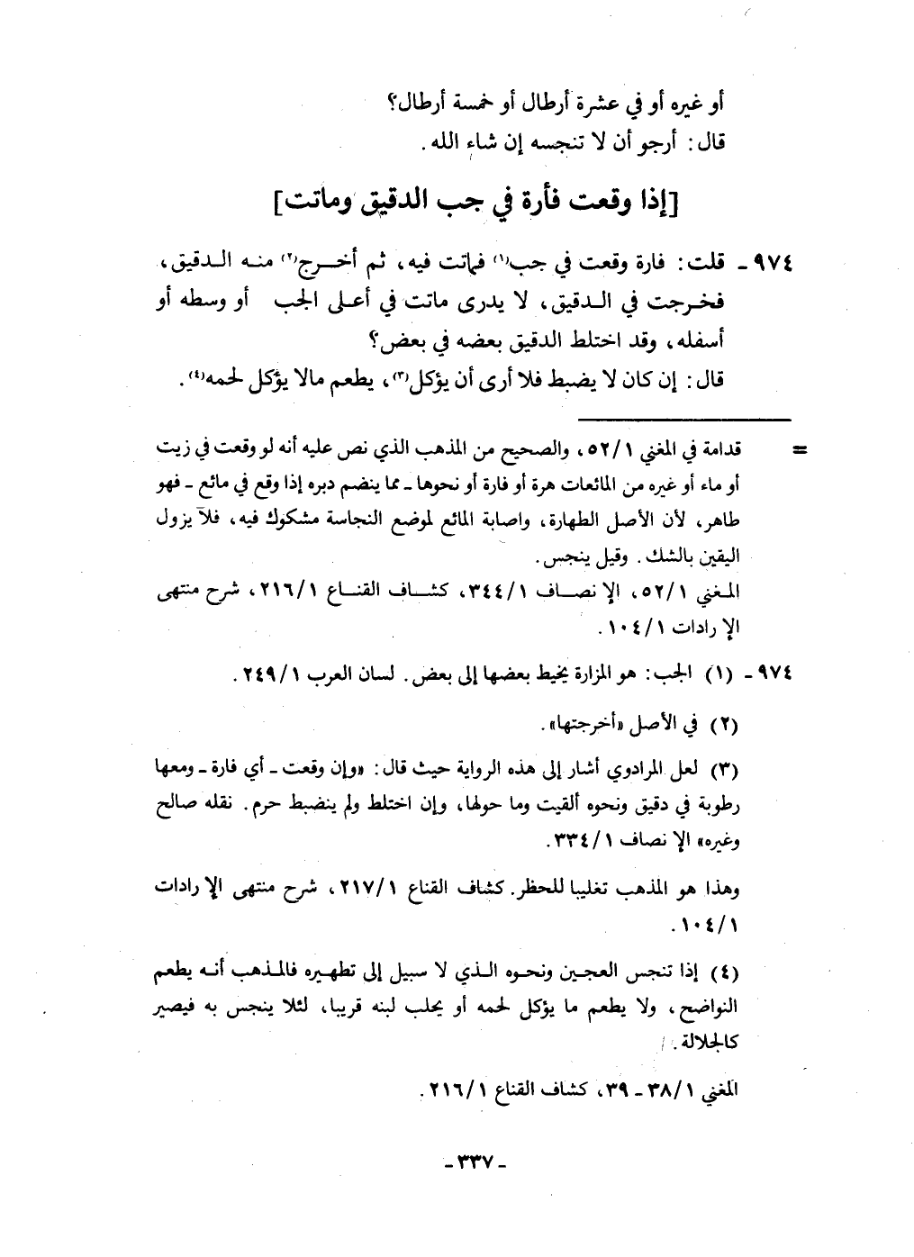 974 - قلت فارة وَقعت فِي جب فَمَاتَتْ فِيهِ ثمَّ أخرج مِنْهُ الدَّقِيق فَخرجت فِي الدَّقِيق لَا يدْرِي مَاتَت فِي أَعلَى الْجب أَو وَسطه أَو أَسْفَله وَقد اخْتَلَط الدَّقِيق بعضه فِي بعض قَالَ إِن كَانَ لَا يضْبط فَلَا أرى أَن يُؤْكَل يطعم مَالا يُؤْكَل لَحْمه