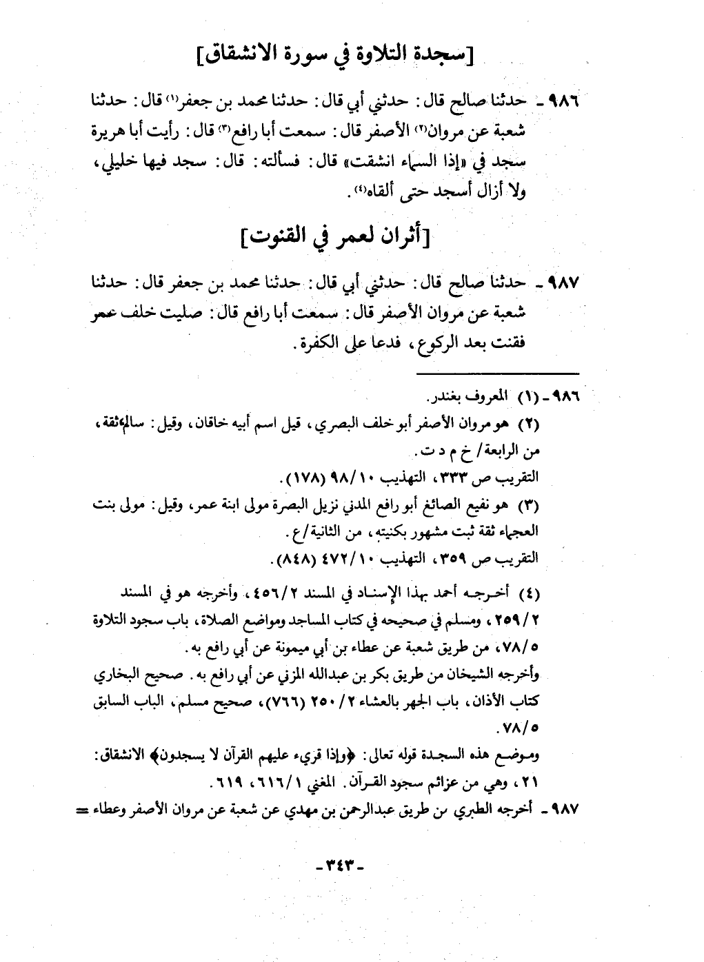 986 - حَدثنَا صَالح قَالَ حَدثنِي أبي قَالَ حَدثنَا مُحَمَّد بن جَعْفَر قَالَ حَدثنَا شُعْبَة عَن مَرْوَان الْأَصْفَر قَالَ سَمِعت أَبَا رَافع قَالَ رَأَيْت أَبَا هُرَيْرَة سجد فِي {إِذا السَّمَاء انشقت} قَالَ فَسَأَلته قَالَ سجد فِيهَا خليلي وَلَا أَزَال أَسجد حَتَّى أَلْقَاهُ