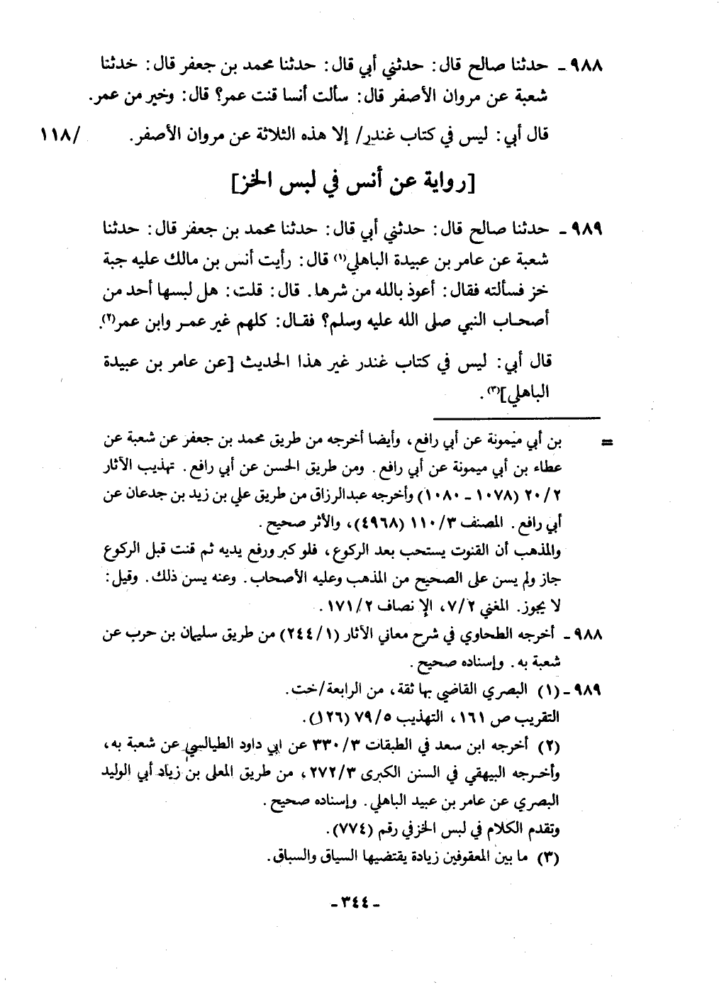 989 - حَدثنَا صَالح قَالَ حَدثنِي أبي قَالَ حَدثنَا مُحَمَّد بن جَعْفَر قَالَ حَدثنَا شُعْبَة عَن عَامر بن عُبَيْدَة الْبَاهِلِيّ قَالَ رَأَيْت أنس بن مَالك عَلَيْهِ جُبَّة خَز فَسَأَلته فَقَالَ أعوذ بِاللَّه من شَرها قَالَ قلت هَل لبسهَا أحد من أَصْحَاب النَّبِي صلى الله عَلَيْهِ وَسلم فَقَالَ كلهم غير عمر وَابْن عمر قَالَ أبي لَيْسَ فِي كتاب غنْدر غير هَذَا الحَدِيث عَن عَامر بن عُبَيْدَة الْبَاهِلِيّ