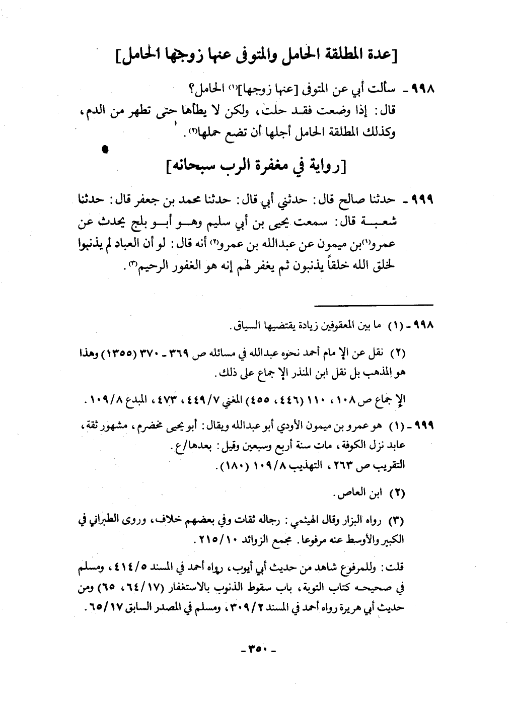 998 - سَأَلت أبي عَن الْمُتَوفَّى عَنْهَا زَوجهَا الْحَامِل قَالَ إِذا وضعت فقد حلت وَلَكِن لَا يَطَأهَا حَتَّى تطهر من الدَّم وَكَذَلِكَ الْمُطلقَة الْحَامِل أجلهَا أَن تضع حملهَا
