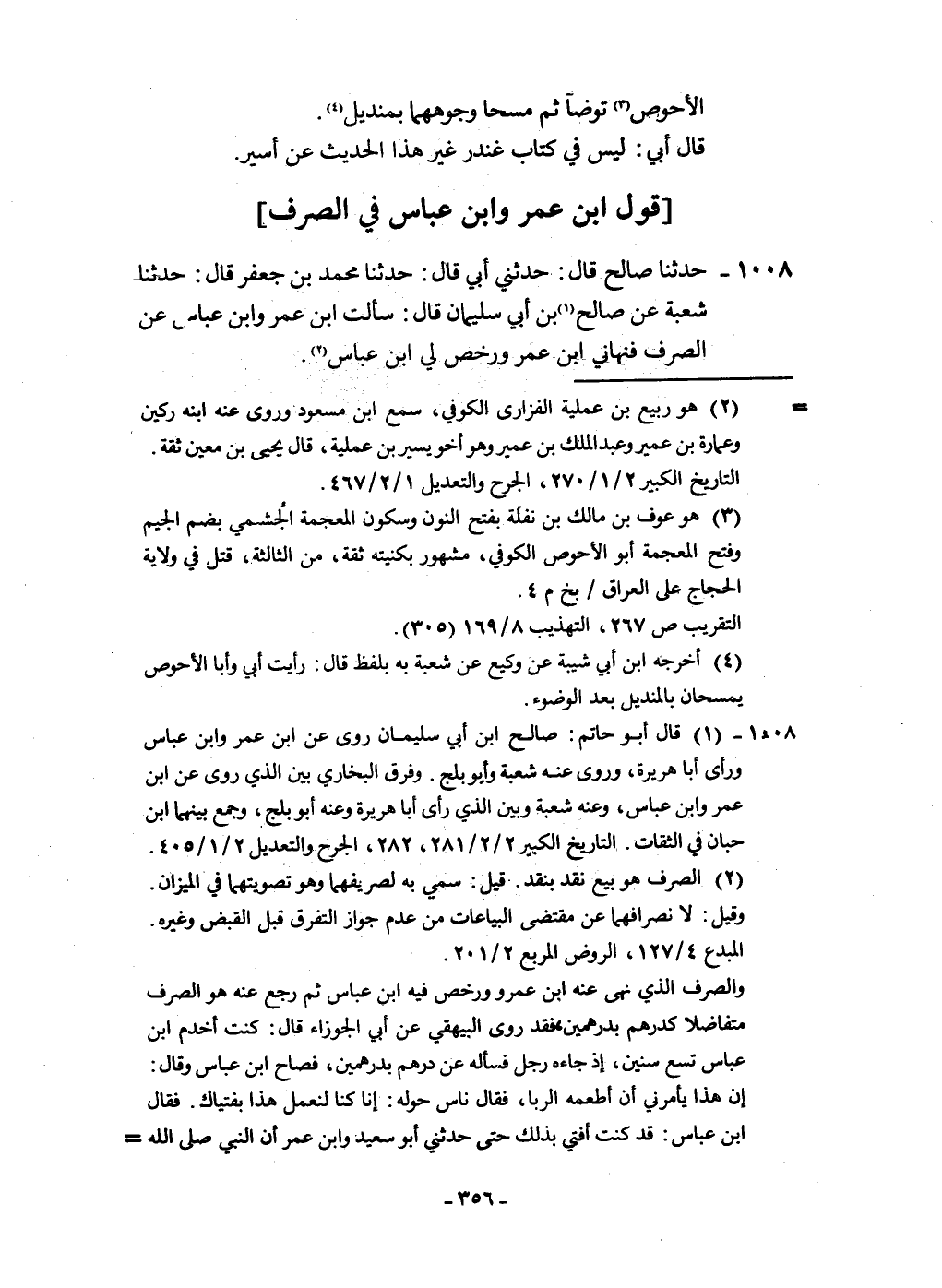 1008 - حَدثنَا صَالح قَالَ حَدثنِي أبي قَالَ حَدثنَا مُحَمَّد بن جَعْفَر قَالَ حَدثنَا شُعْبَة عَن صَالح بن أبي سُلَيْمَان قَالَ سَأَلت ابْن عمر وَابْن عَبَّاس عَن الصّرْف فنهاني ابْن عمر وَرخّص لي ابْن عَبَّاس